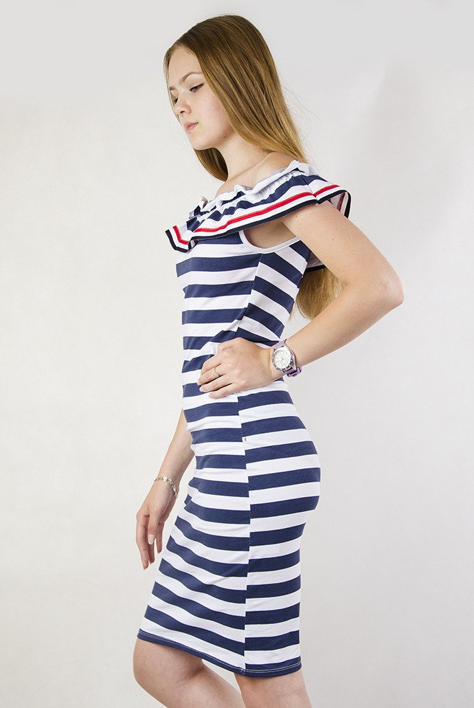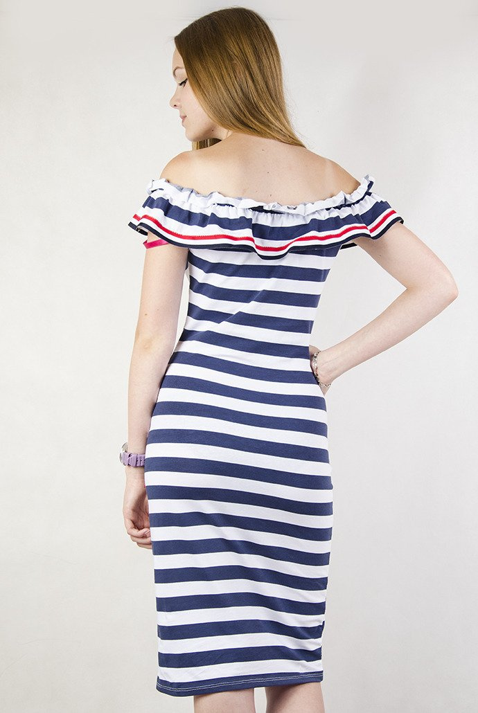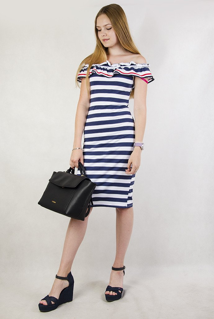 Przylegająca sukienka w paski, z szerokim dekoltem