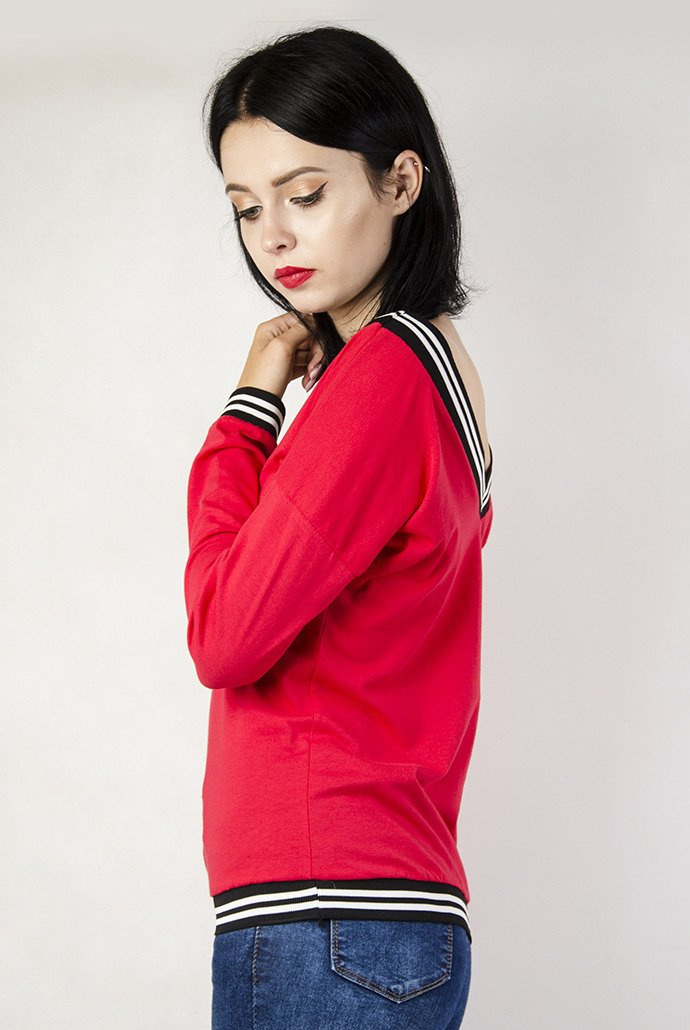 Czerwona bluzka z wyciętym dekoltem. Posiada nadruk "ICON".