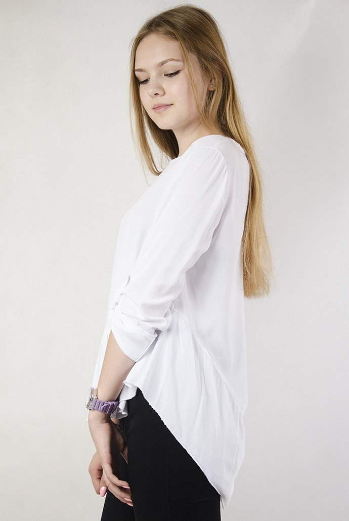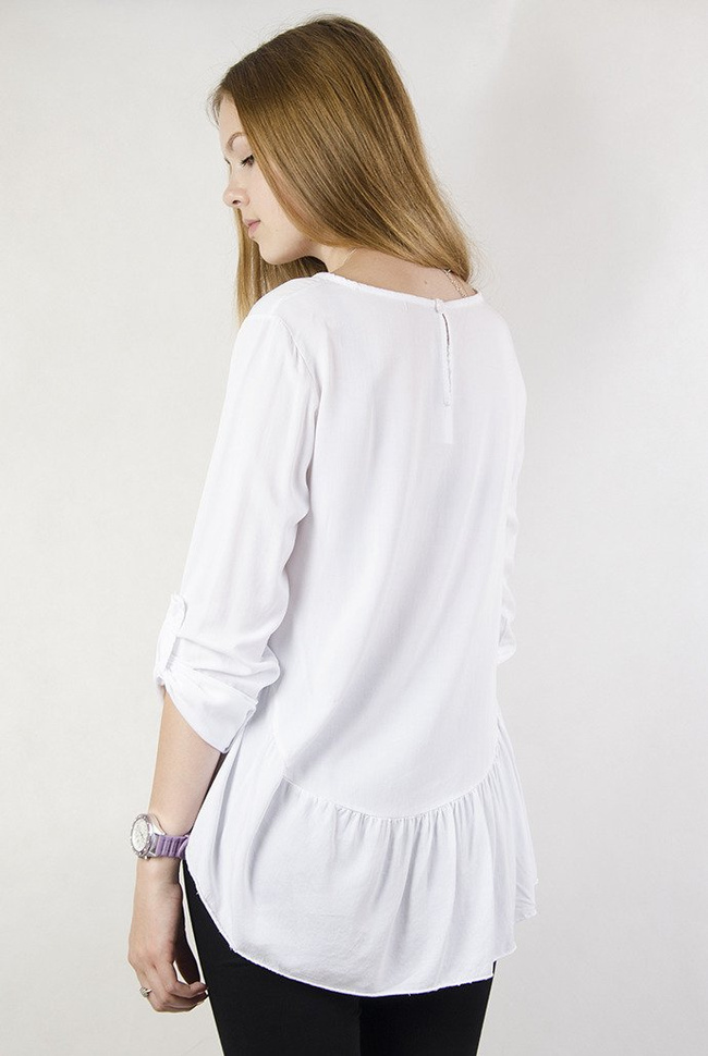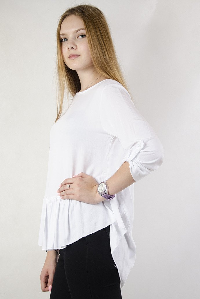 Biała, gładka bluzka z odcięciem na dole. Posiada możliwość zapięcia rękawa.