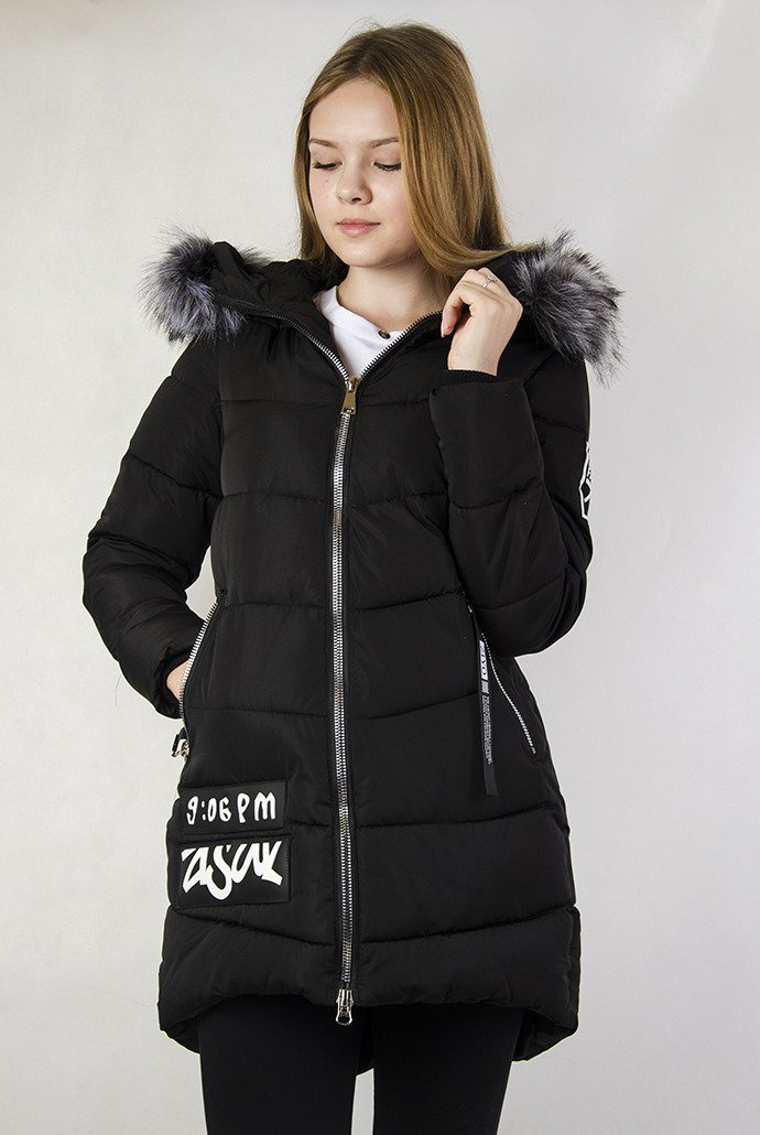 Czarna, pikowana, przedłużana kurtka z naszywkami.