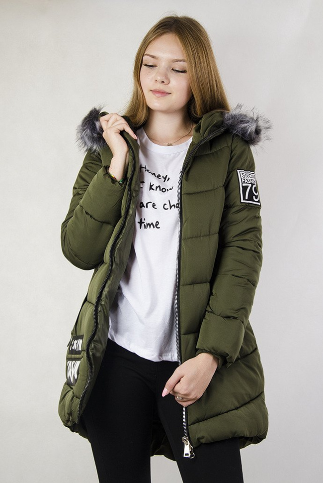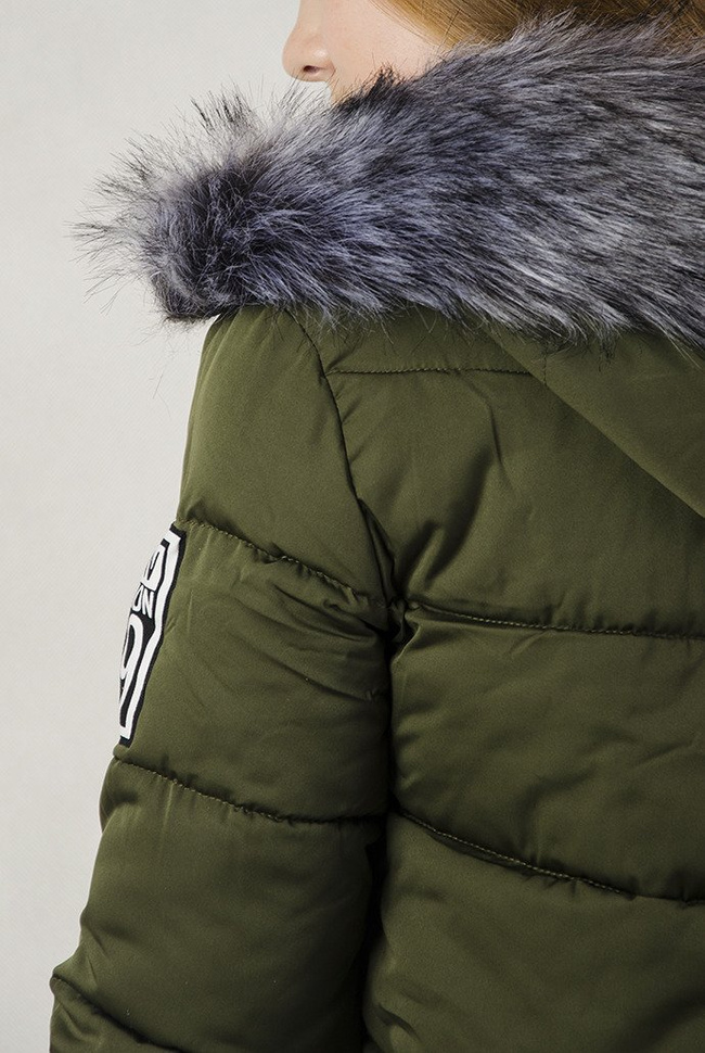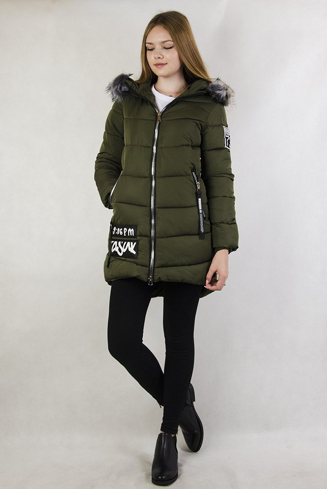 Zielona, pikowana, przedłużana kurtka z naszywkami.