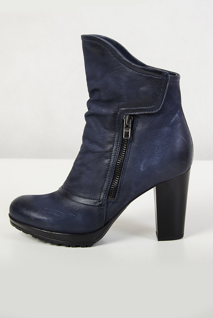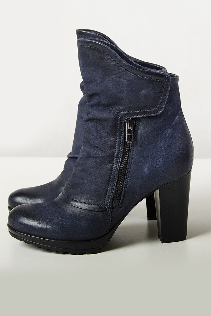 Fason charakteryzuje asymetryczna cholewka oraz zapięcie na suwak i zatrzask, pełniące również funkcję dekoracyjną.