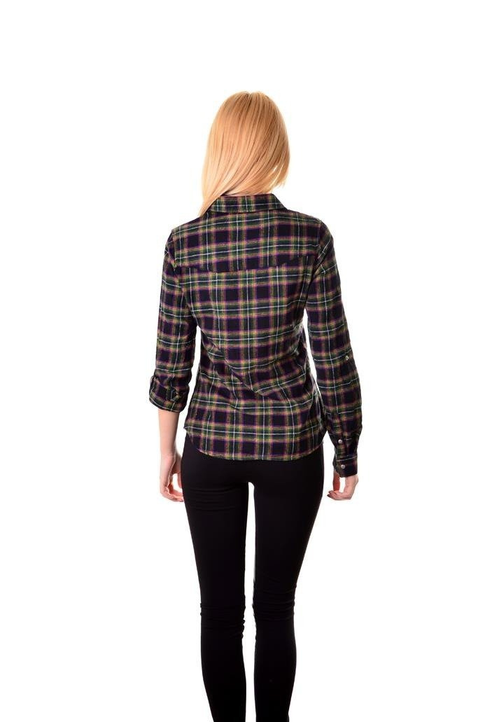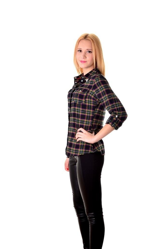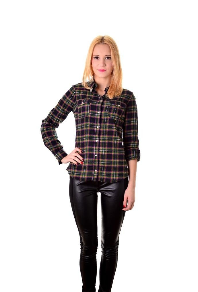 Niezwykle stylowa koszula, z kołnierzykiem wykończonym ozdobą blaszką. Zapinana na guziki. Z przodu dwie kieszonki.