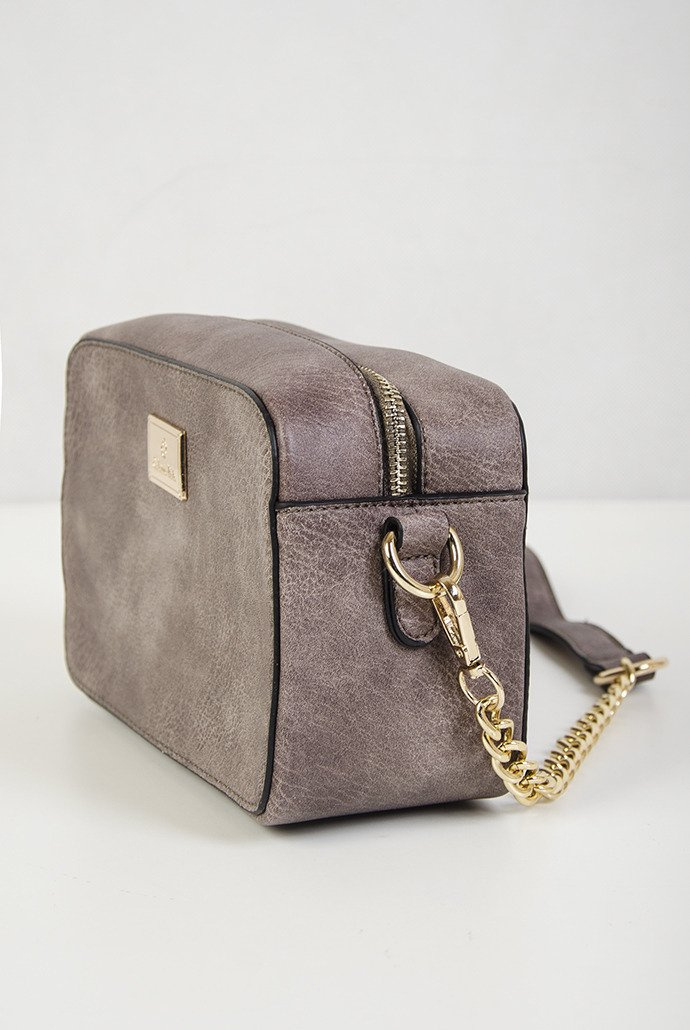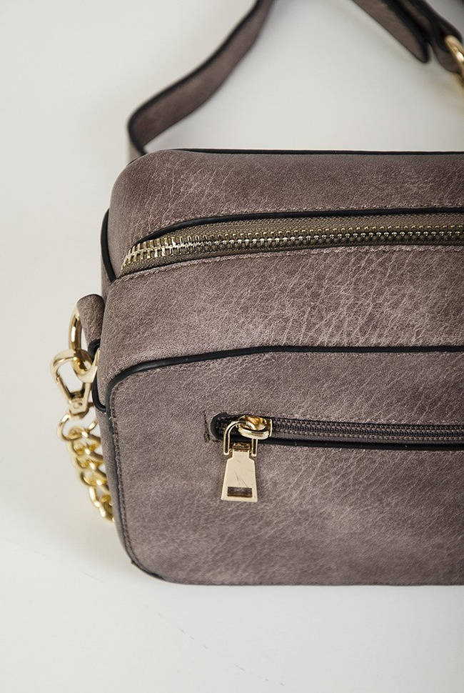 Brązowa, mała torebka z łańcuszkiem połączonym z regulowanym paskiem. W niej schowasz najpotrzebniejsze przedmioty, a przy tym będziesz wyglądać świetnie! W środku jedna główna komora bez przegródek.