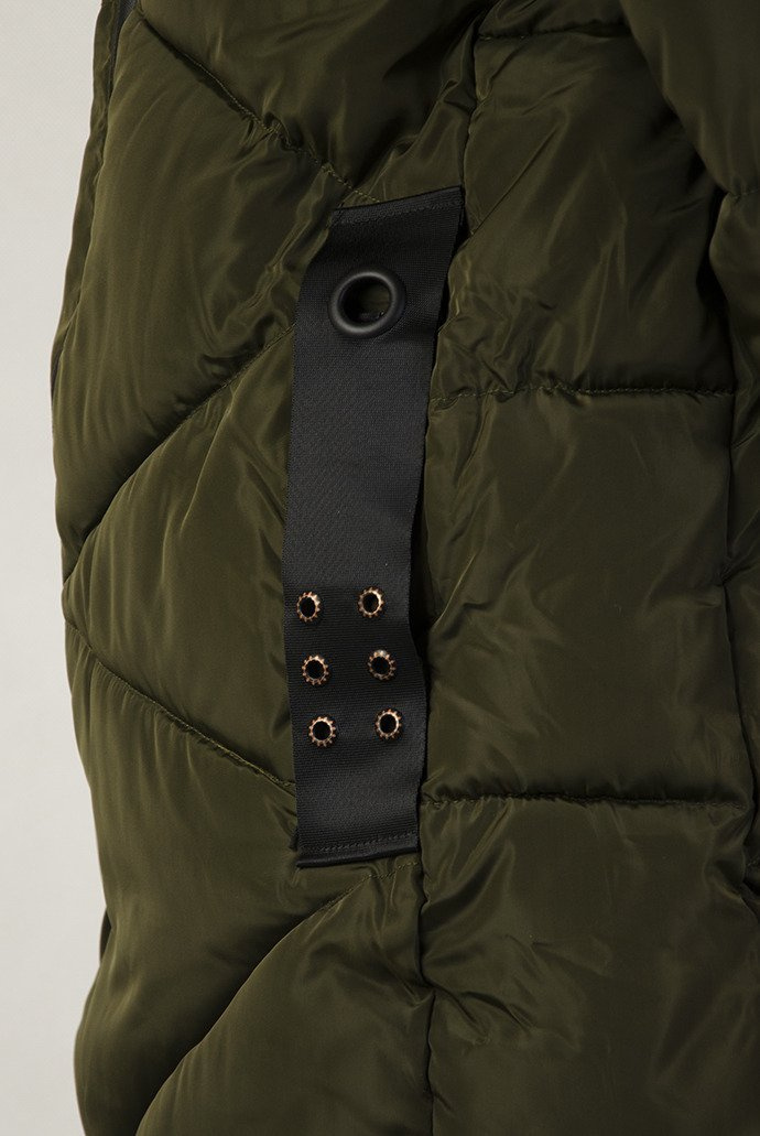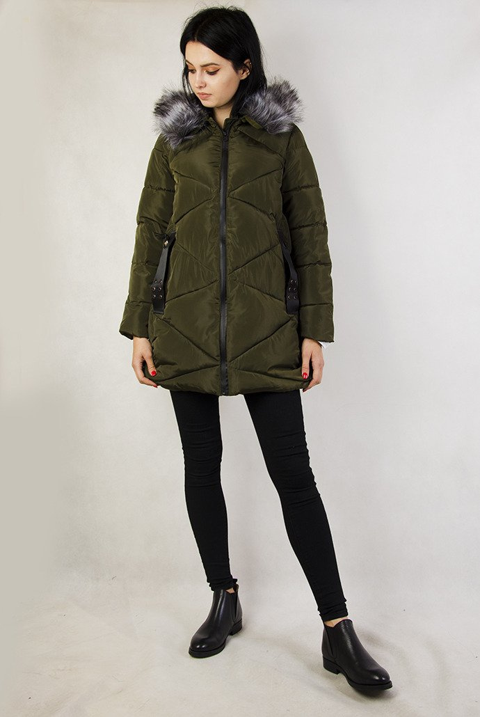 Zielona pikowana kurtka z ozdobnymi paskami przy kieszeniach.