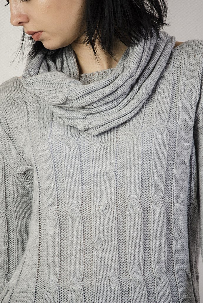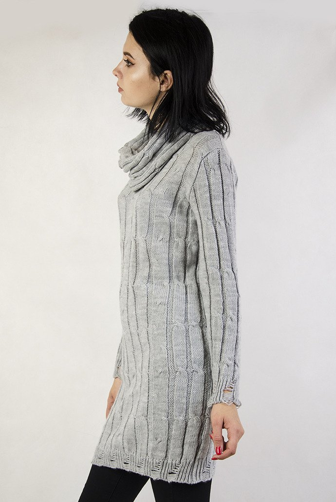 Sweter posiada szarpania na dole oraz przy rękawach.