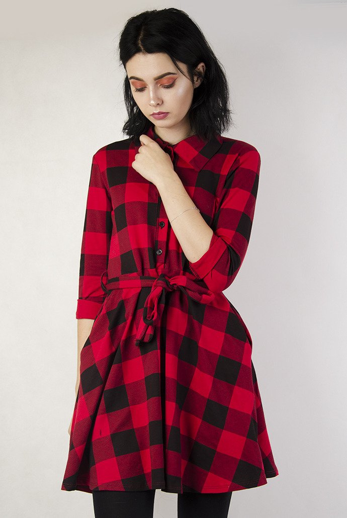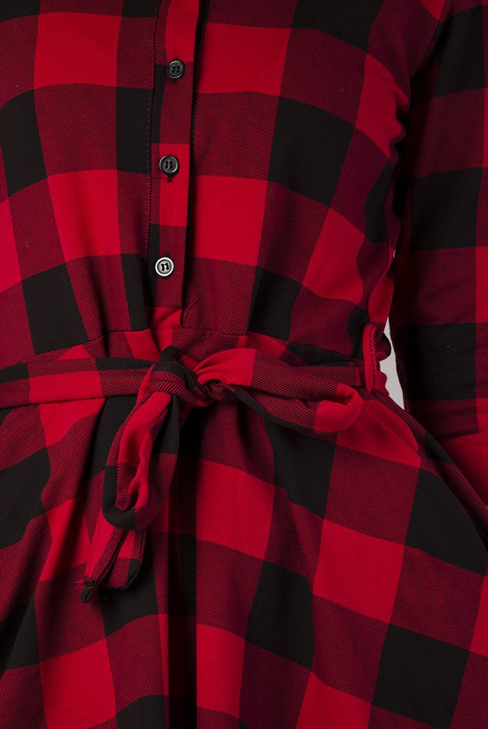 Rozkloszowana sukienka w czerwono-czarną kratę, posiada wiązanie w talii.