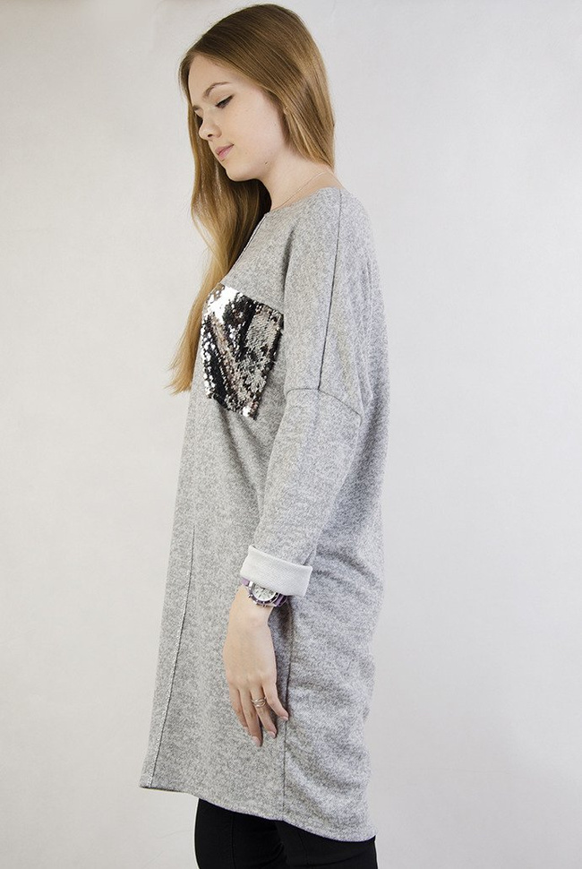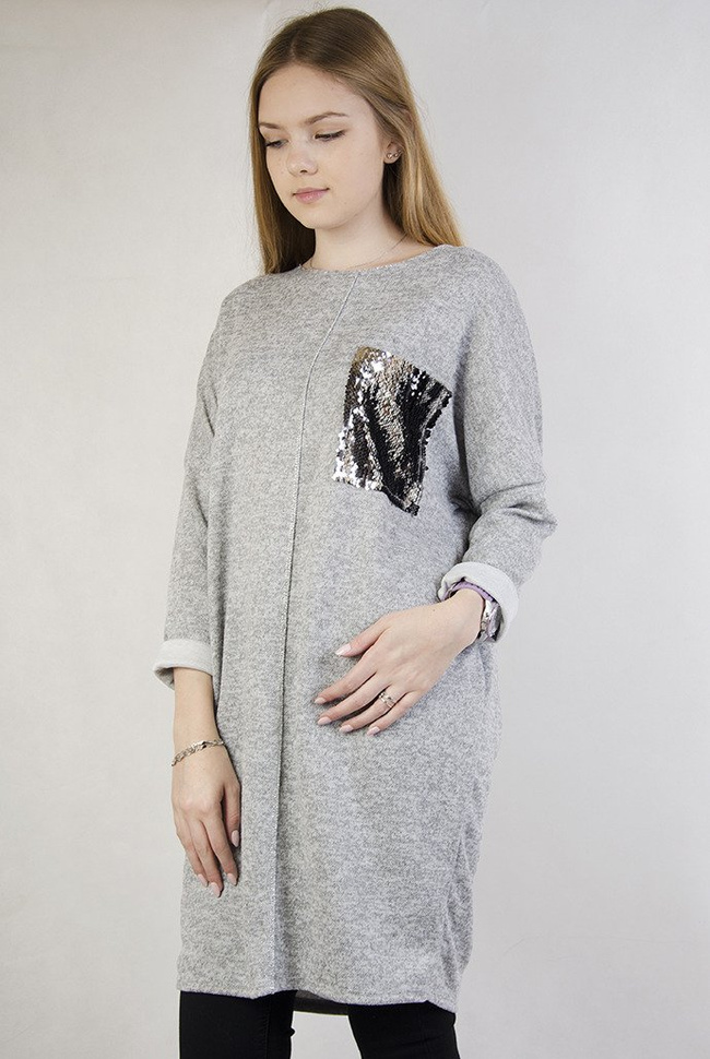 Jasnoszara tunika z cekinową kieszenią oraz przeplatana srebrną nicią