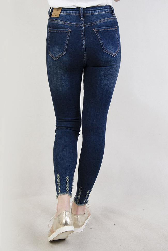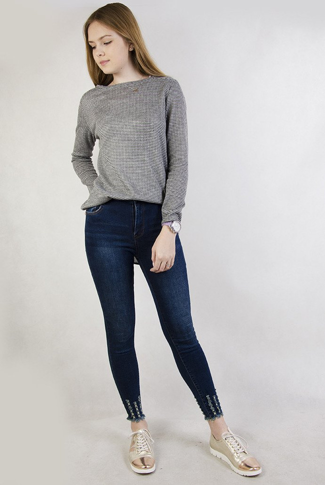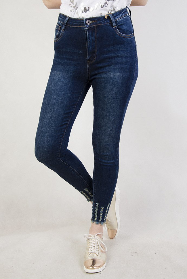 Ciemne spodnie jeansowe z wysokim stanem oraz szarpaniami przy nogawce.