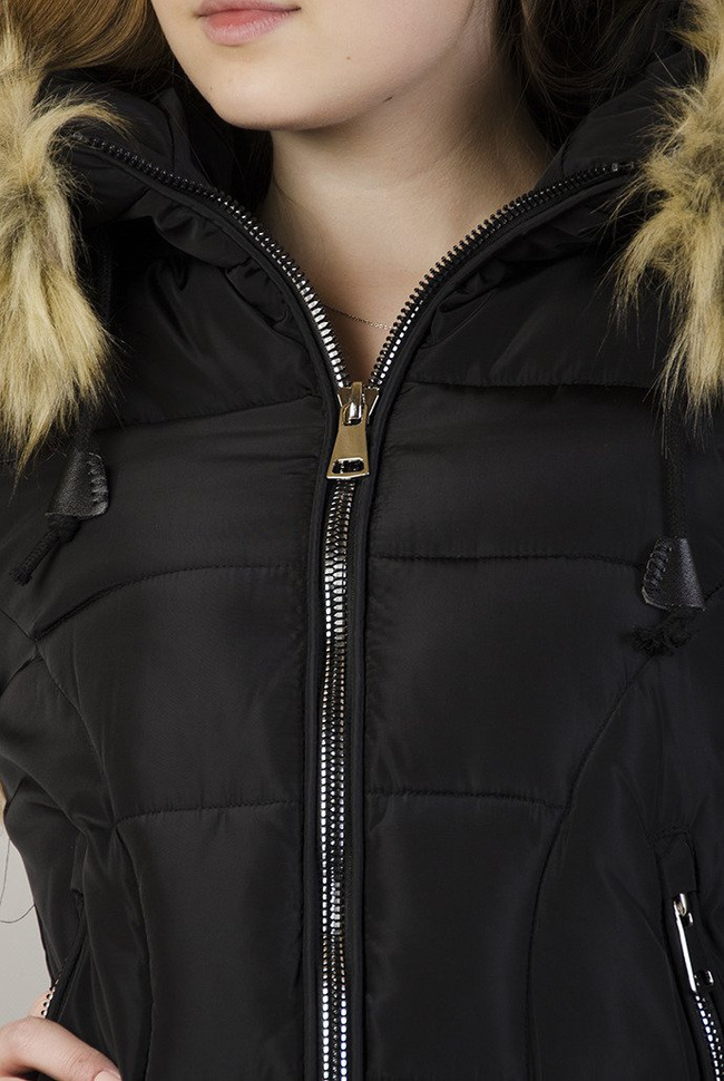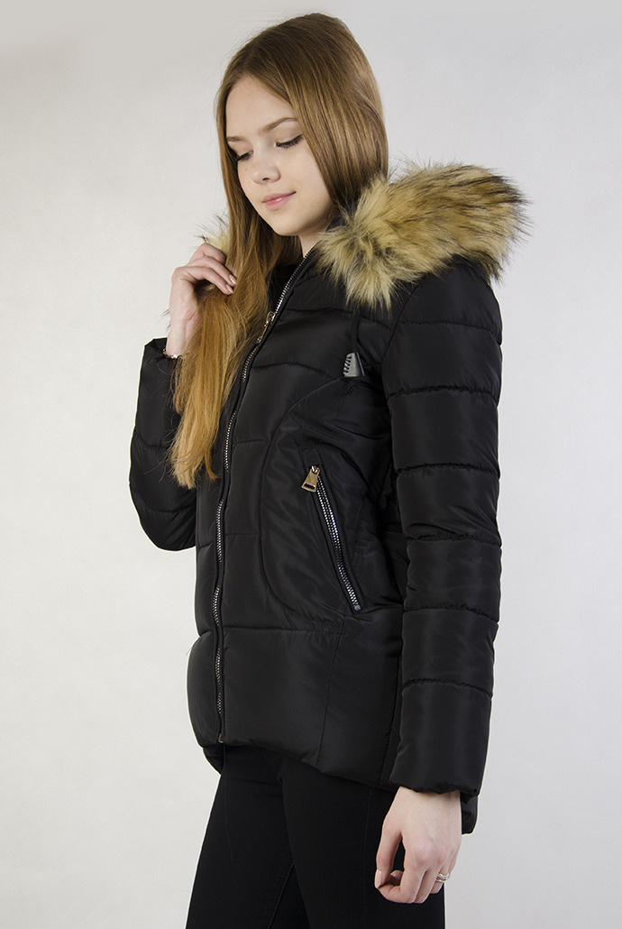 Efektowne duże zamki przy kieszeniach. Futerko  przy kapturze można odpiąć.
