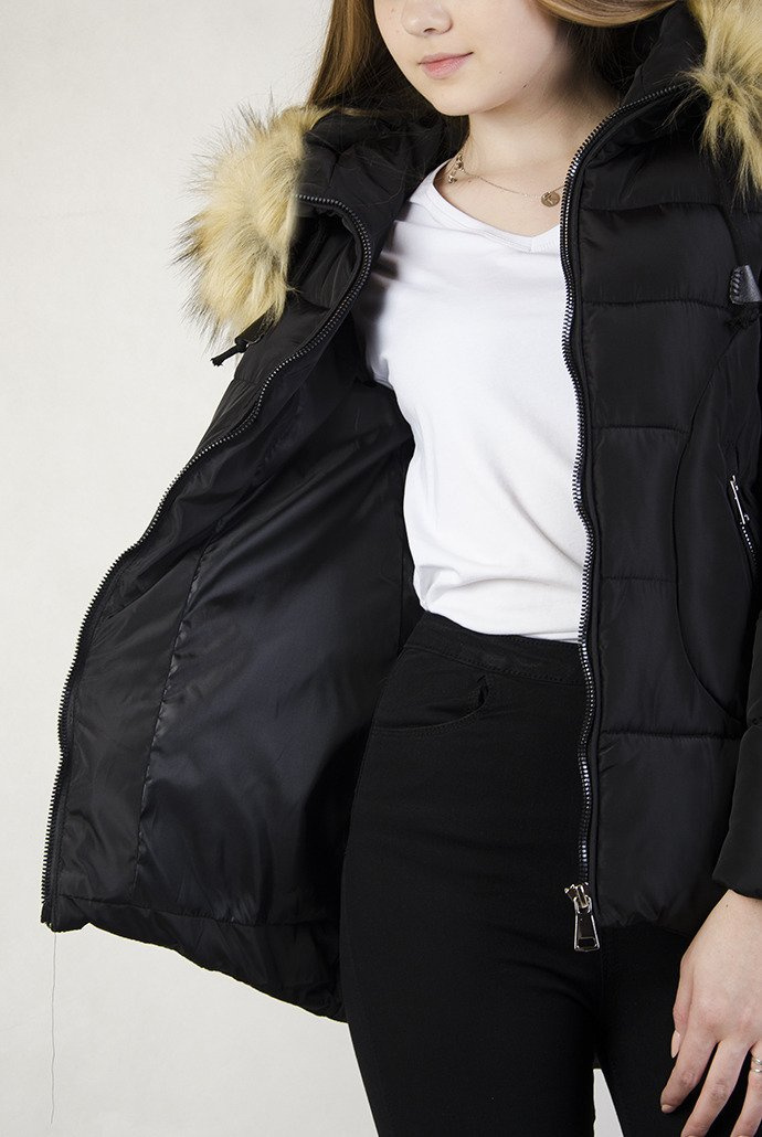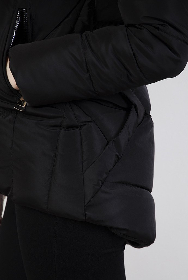Czarna asymetryczna kurtka z pikowaniem oraz futerkiem przy kapturze