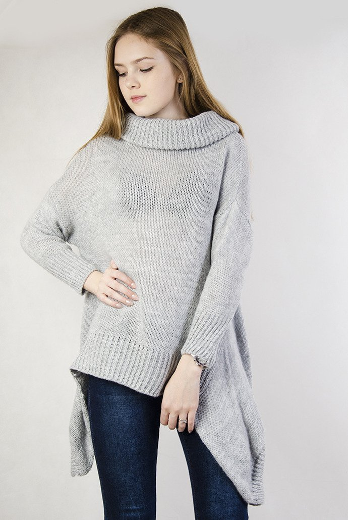 Szary sweter z luźnym golfem oraz przedłużanymi bokami.