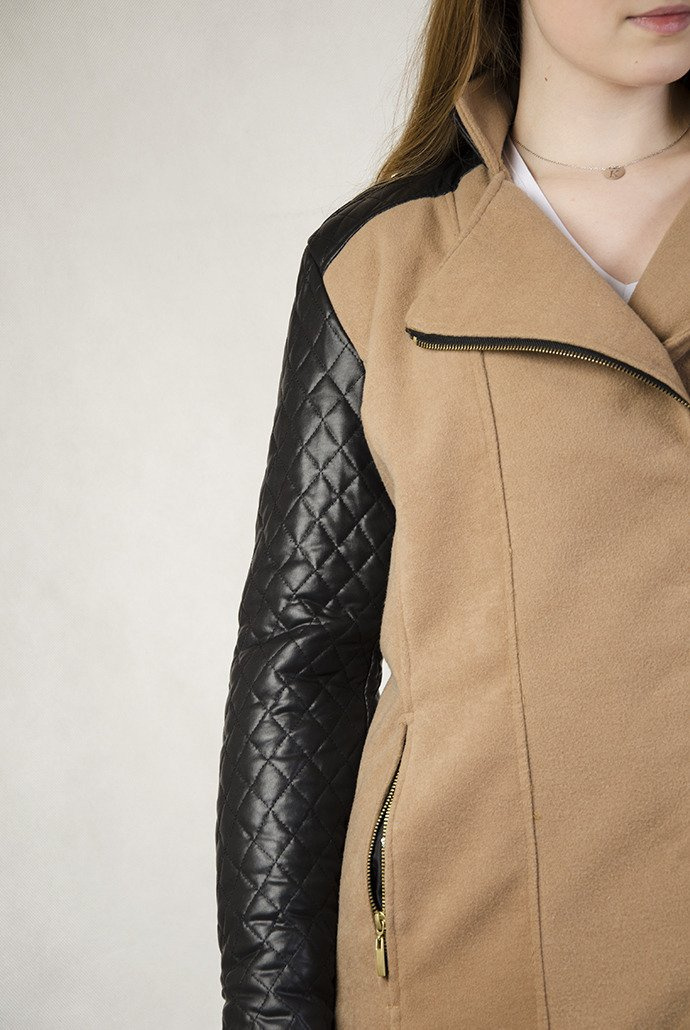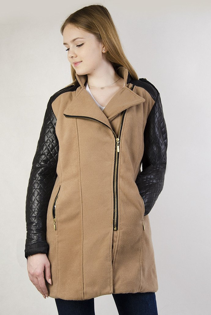 Brązowy płaszcz ze skórzanymi rękawami