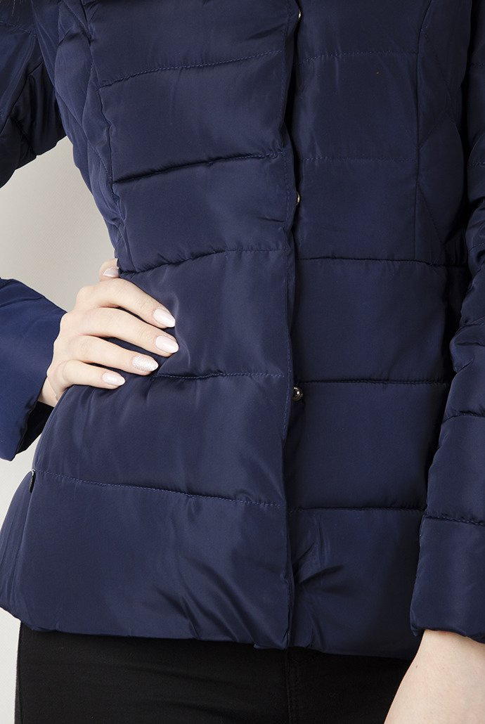 Krótka pikowana granatowa kurtka z futerkiem przy kapturze