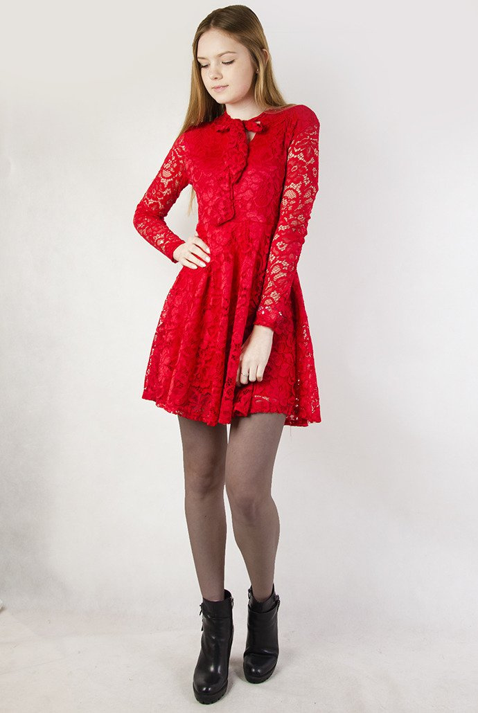 Czerwona rozkloszowana sukienka, cała z koronki z wiązaniem pod szyją.