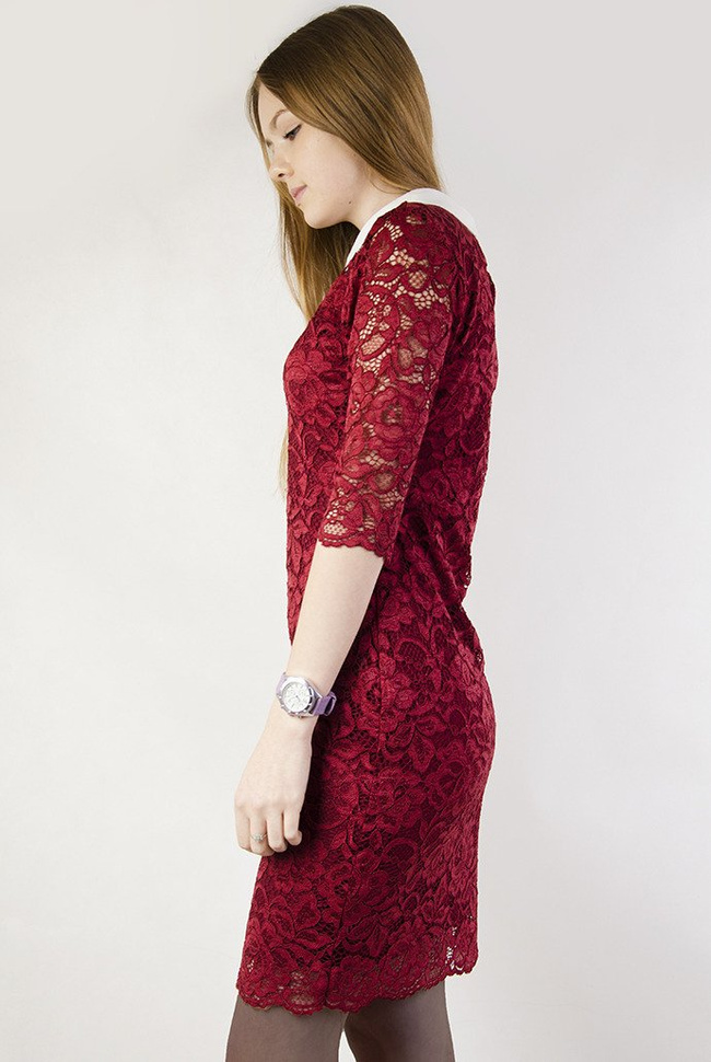 Dopasowana koronkowa sukienka w kolorze bordowym.