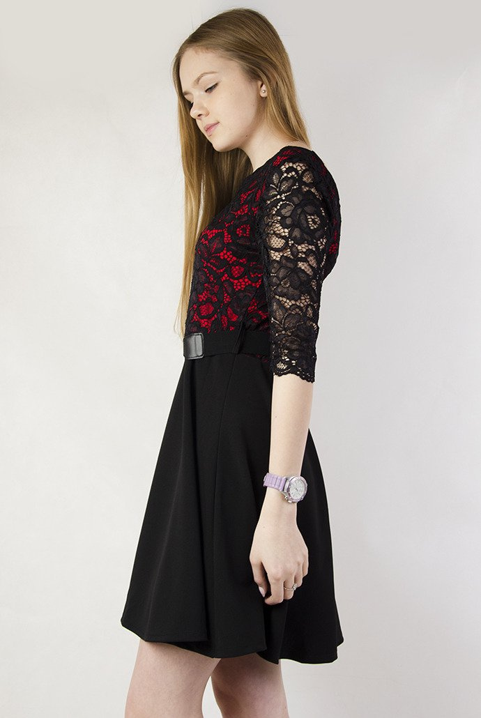 Czarno-czerwona sukienka z górą z koronki oraz rozkloszowanym gładkim dołem.