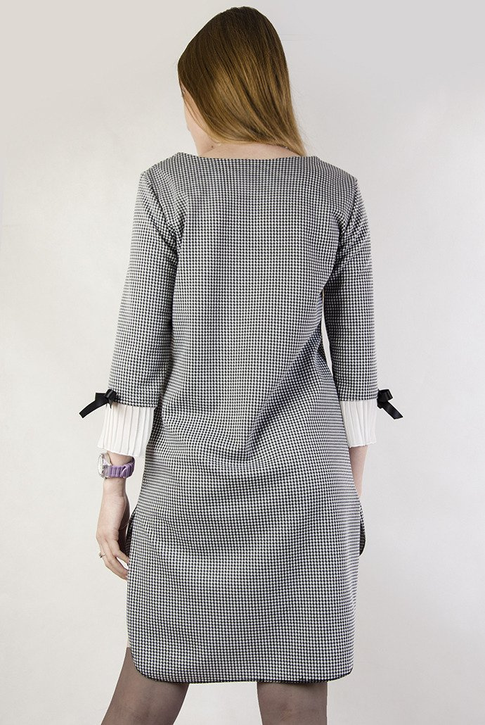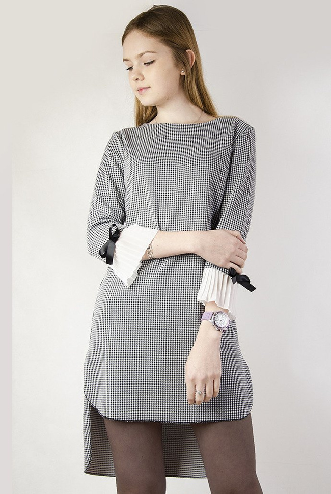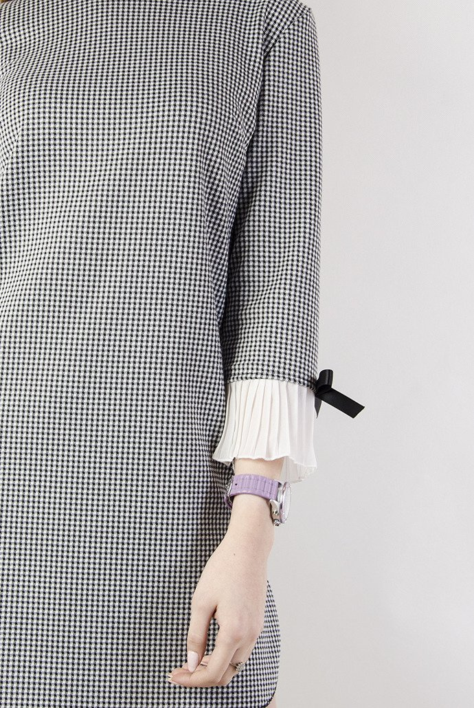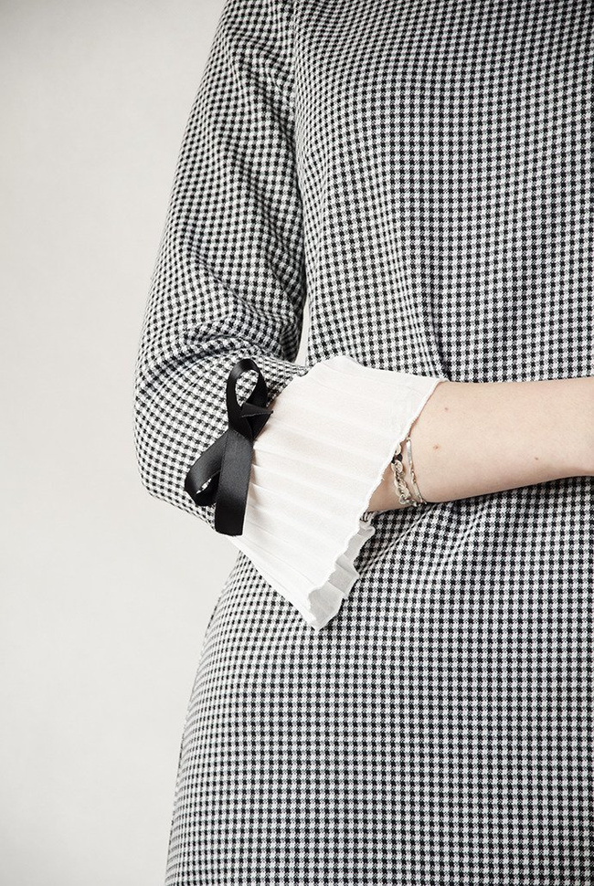 Rękaw zakończony białym plisowaniem oraz czarną kokardką.