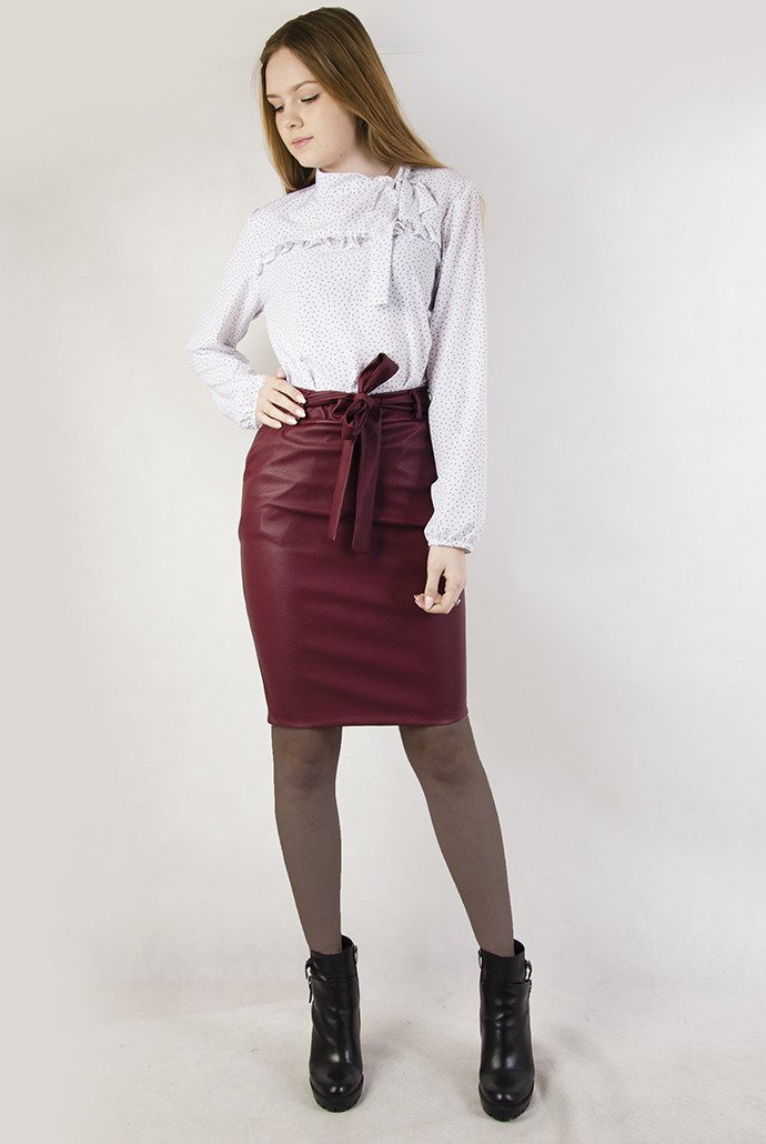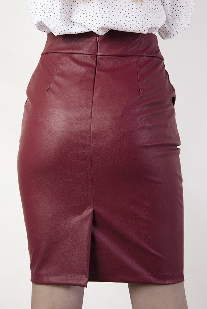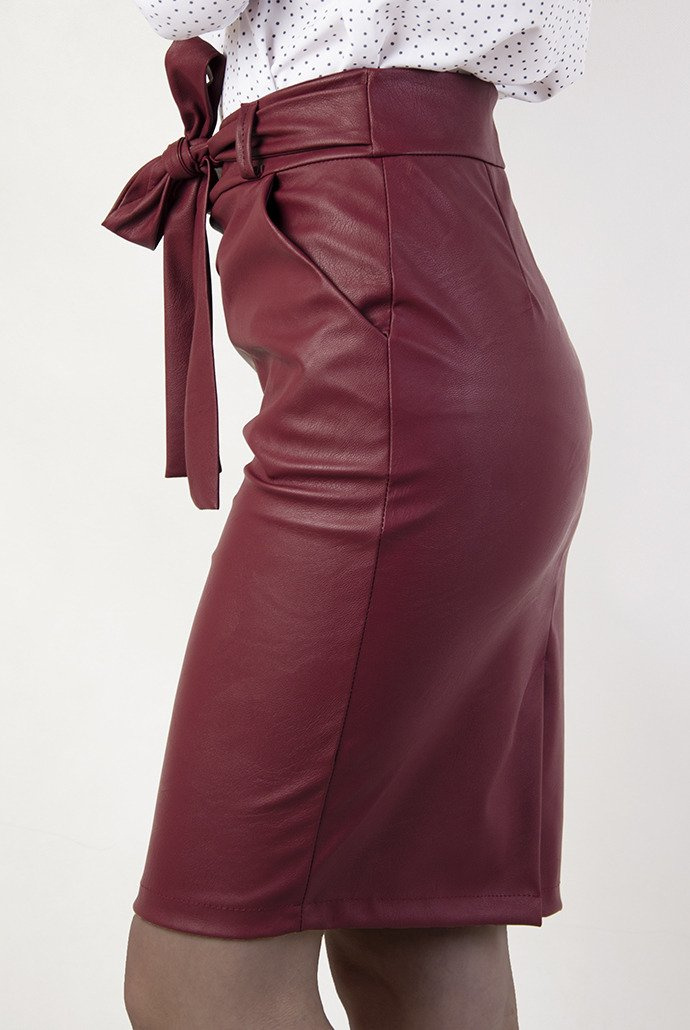 Bordowa ołówkowa spódnica skórkowa z kieszeniami oraz paskiem