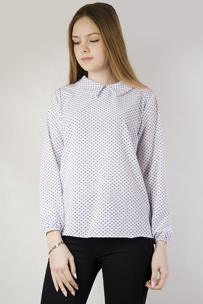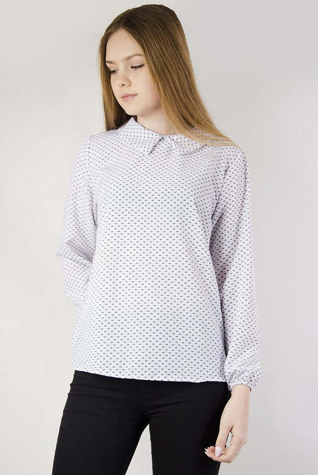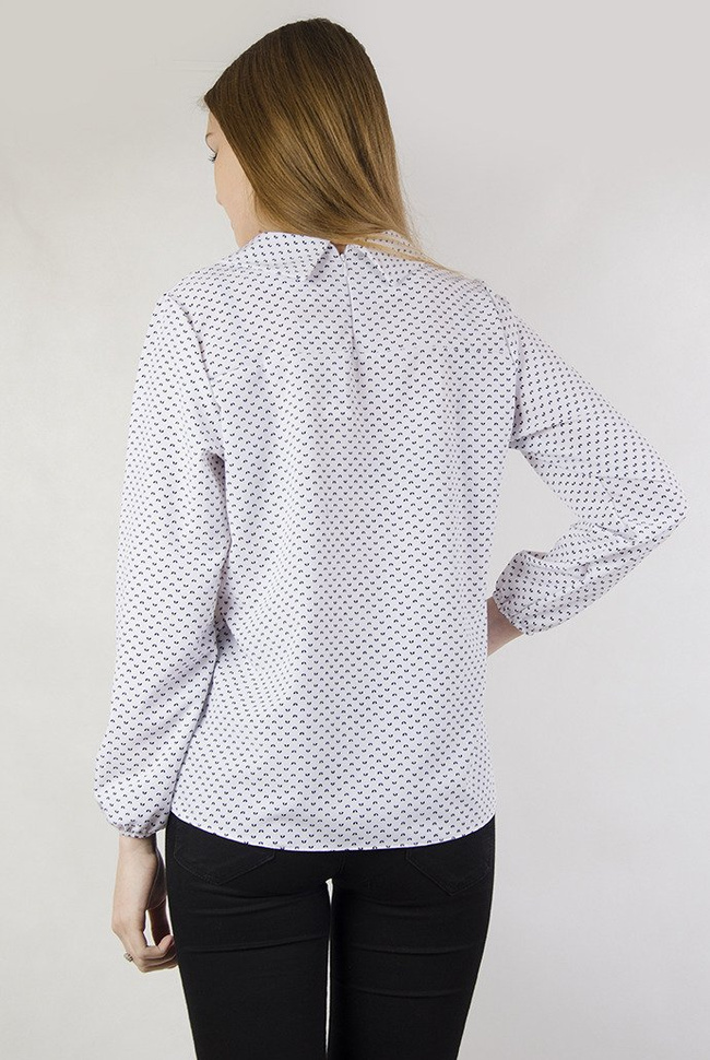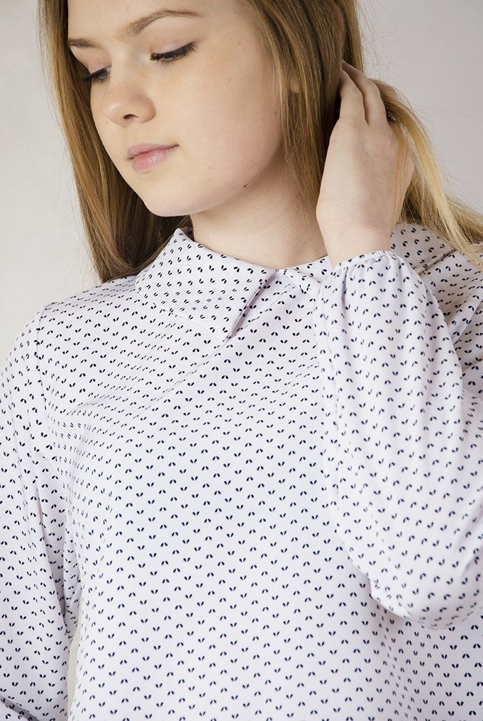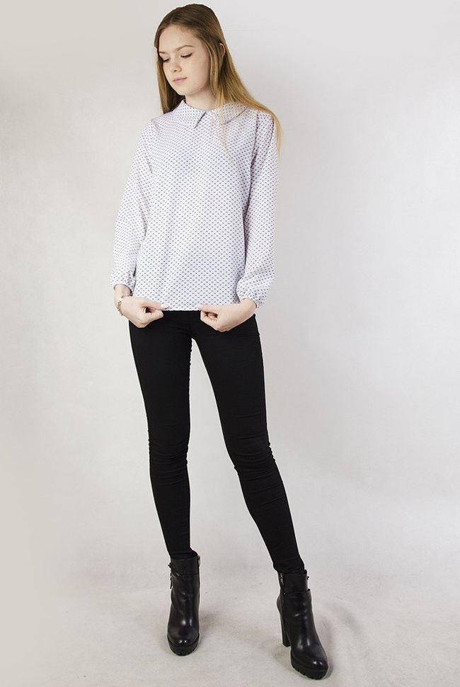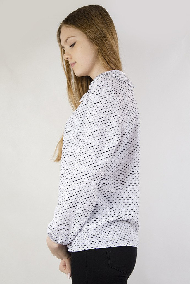 Biała bluzka koszulowa z kołnierzykiem, cała w czarne wzorki