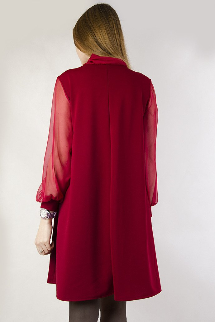 Zwiewna bordowa sukienka z rękawami z tiulu oraz wiązaniem przy dekolcie