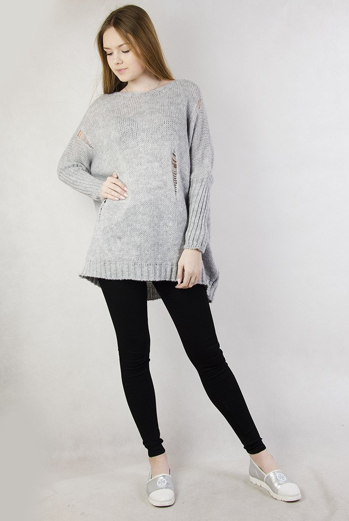 Szary sweter oversize z dziurami oraz dekoltem w serek.
