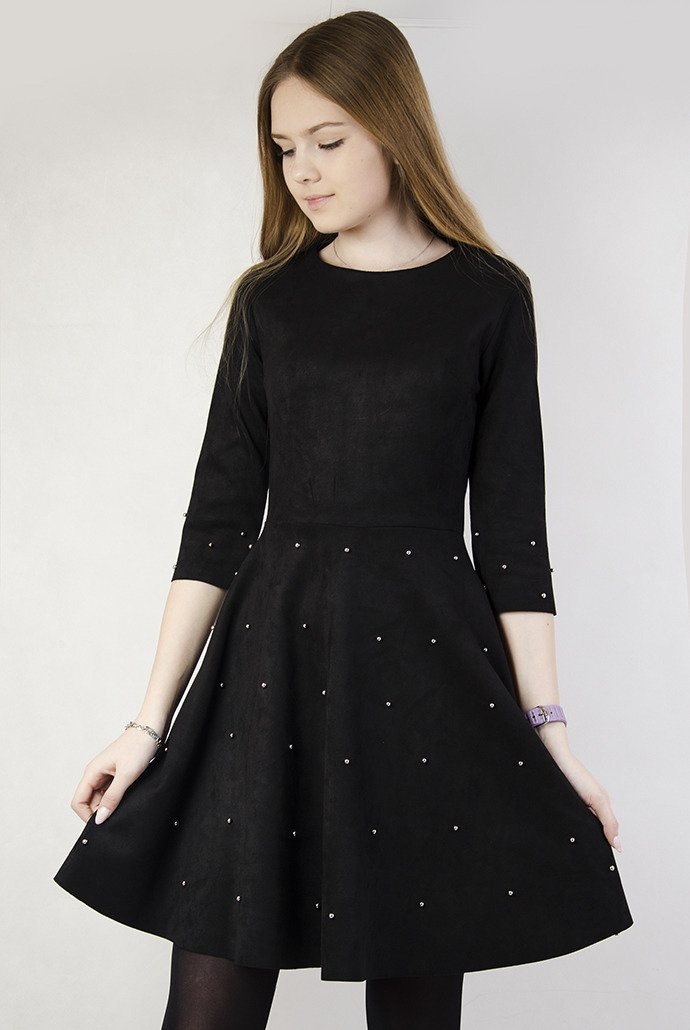 Czarna rozkloszowana zamszowa sukienka z perełkami