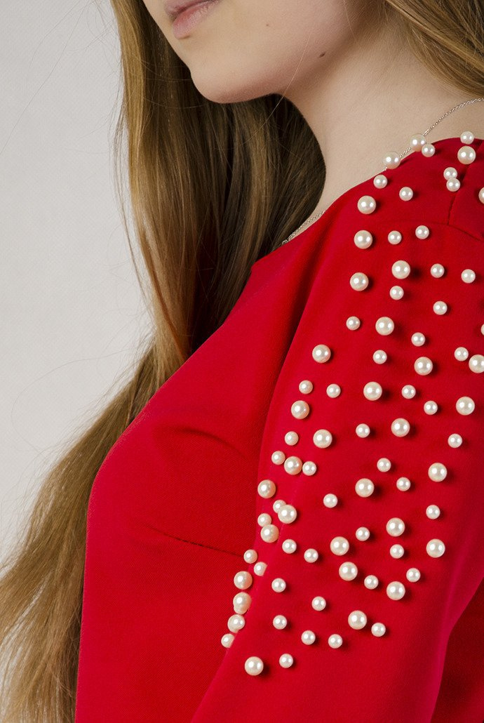 Czerwona dopasowana sukienka z perełkami na ramionach,oraz zamkiem z tyłu.