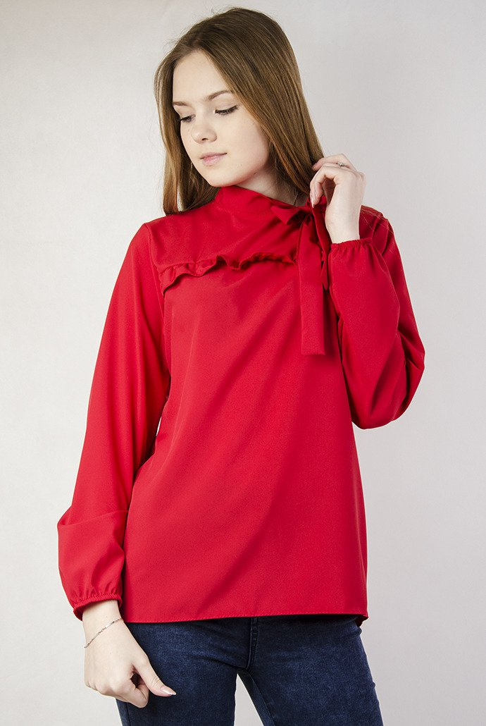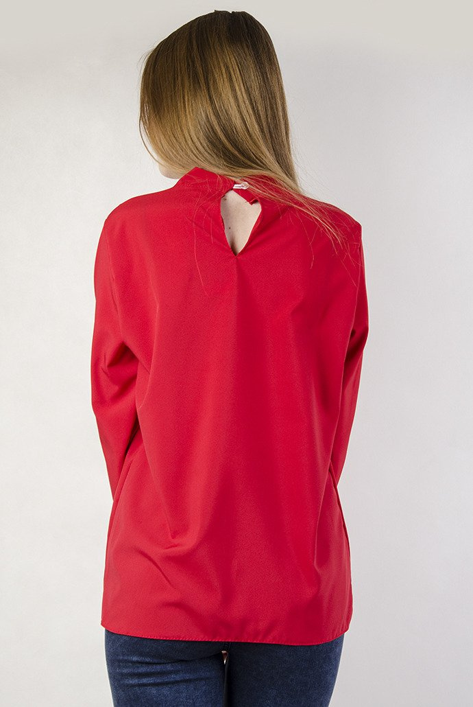 Czerwona bluzka koszulowa z falbanką oraz wiązaniem przy szyi