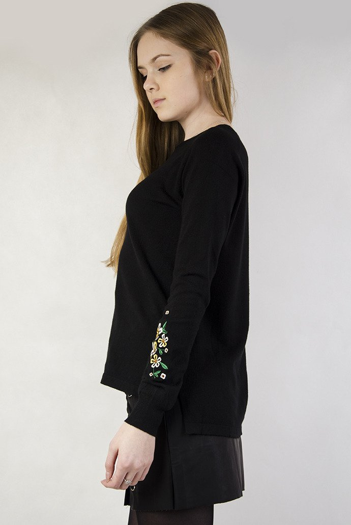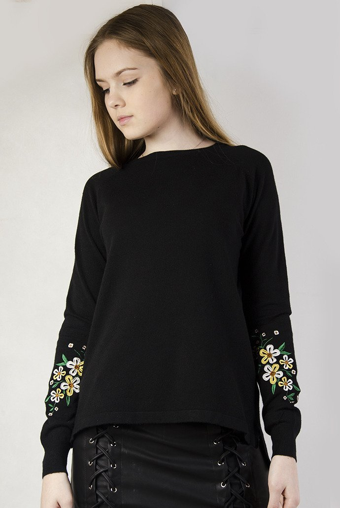 Czarny sweterek z kwiatami haftowanymi na rękawach
