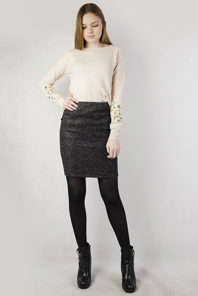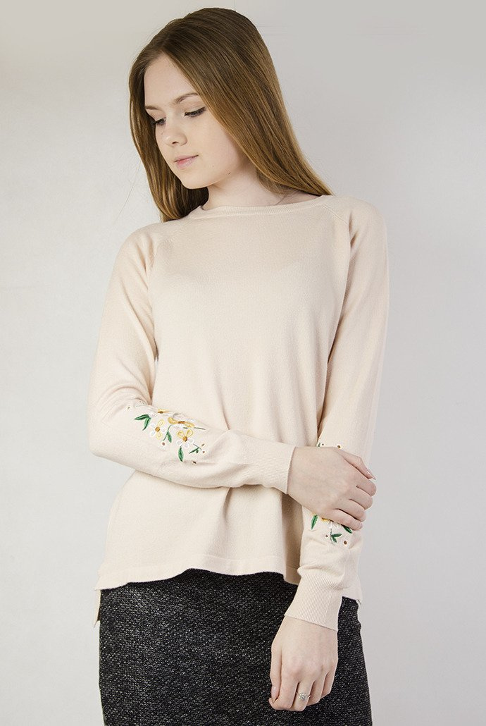 Beżowy sweterek z kwiatami haftowanymi na rękawach