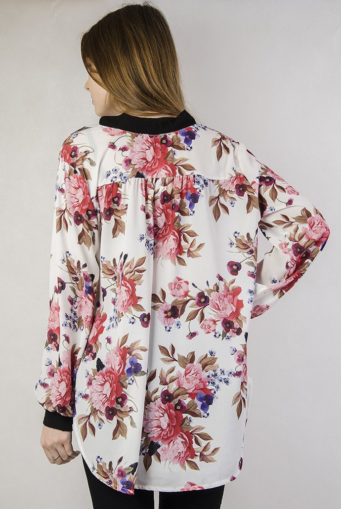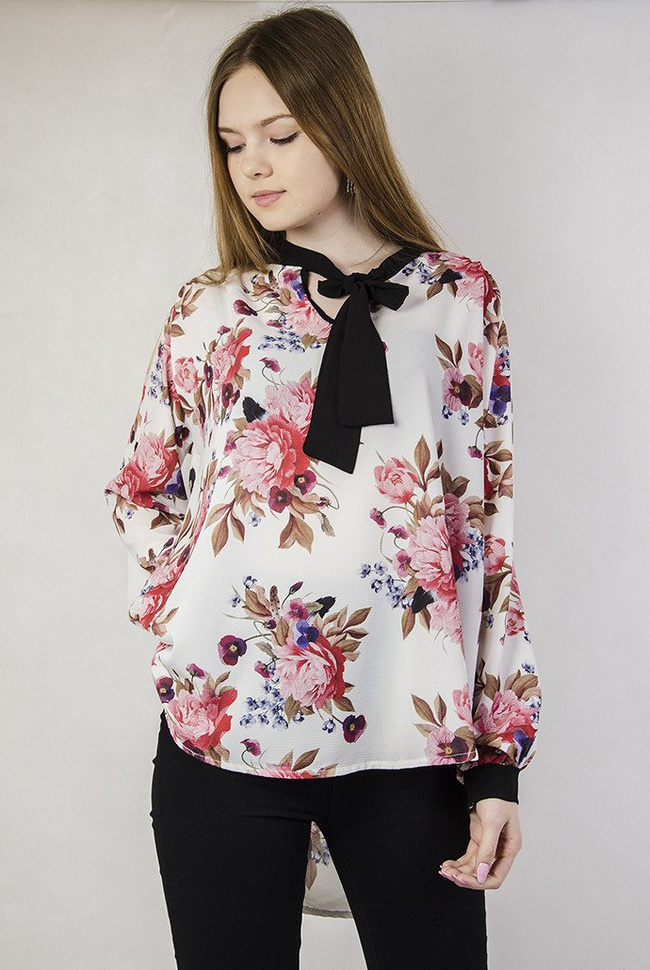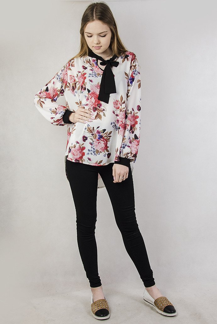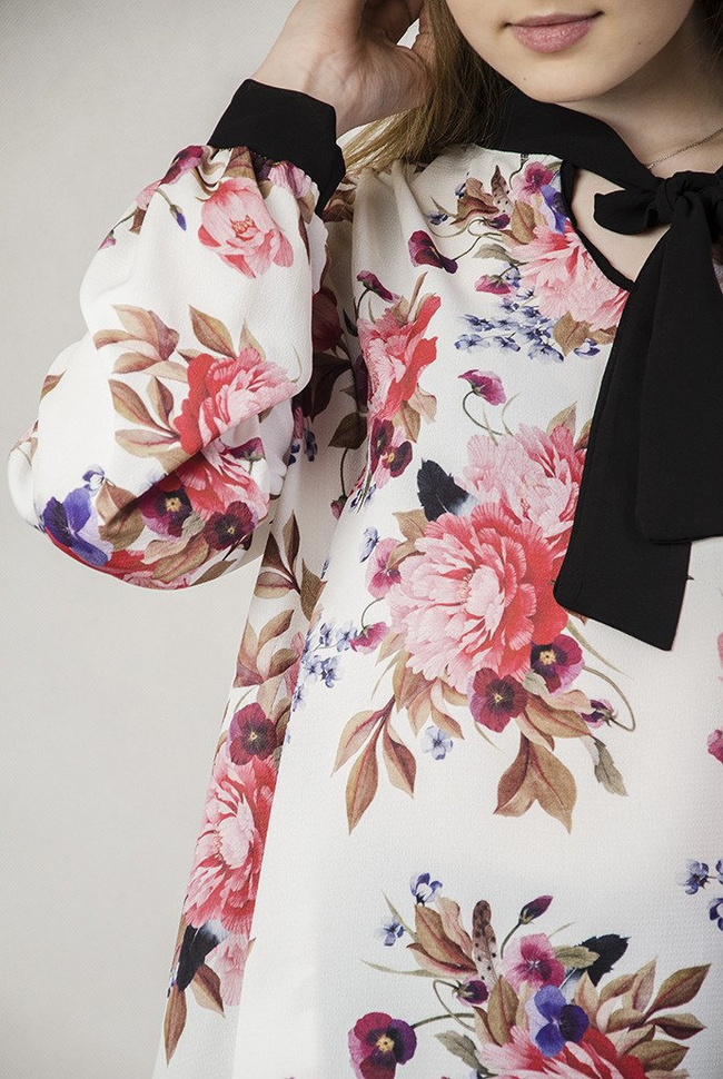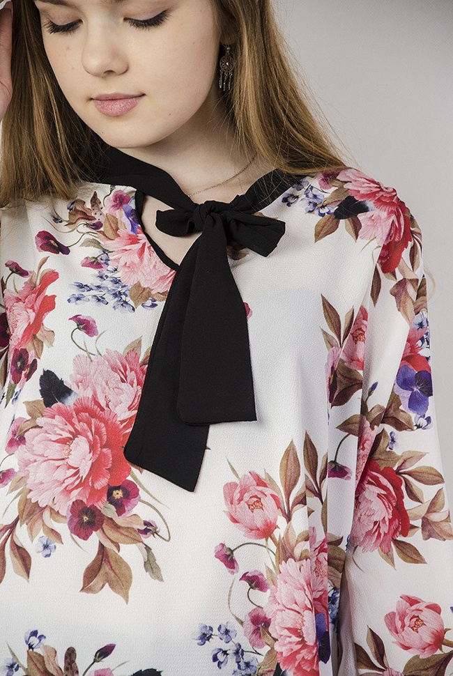 Biała bluzka w kwiaty wiązana przy dekolcie