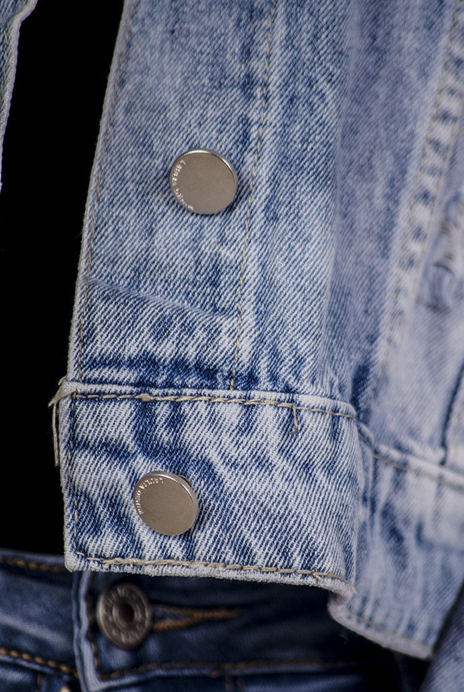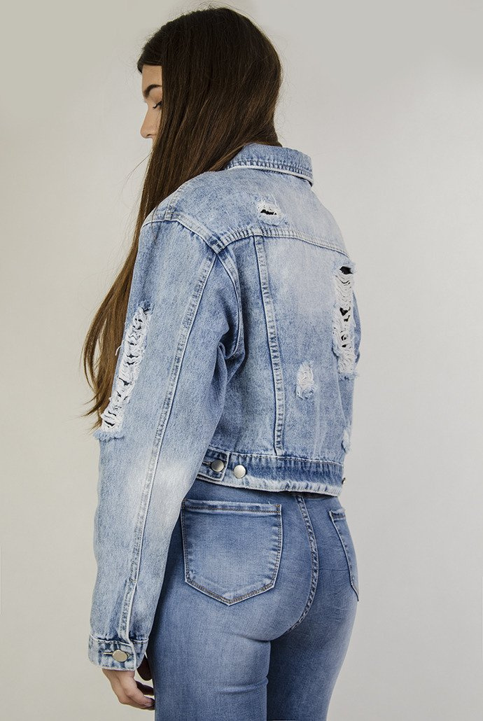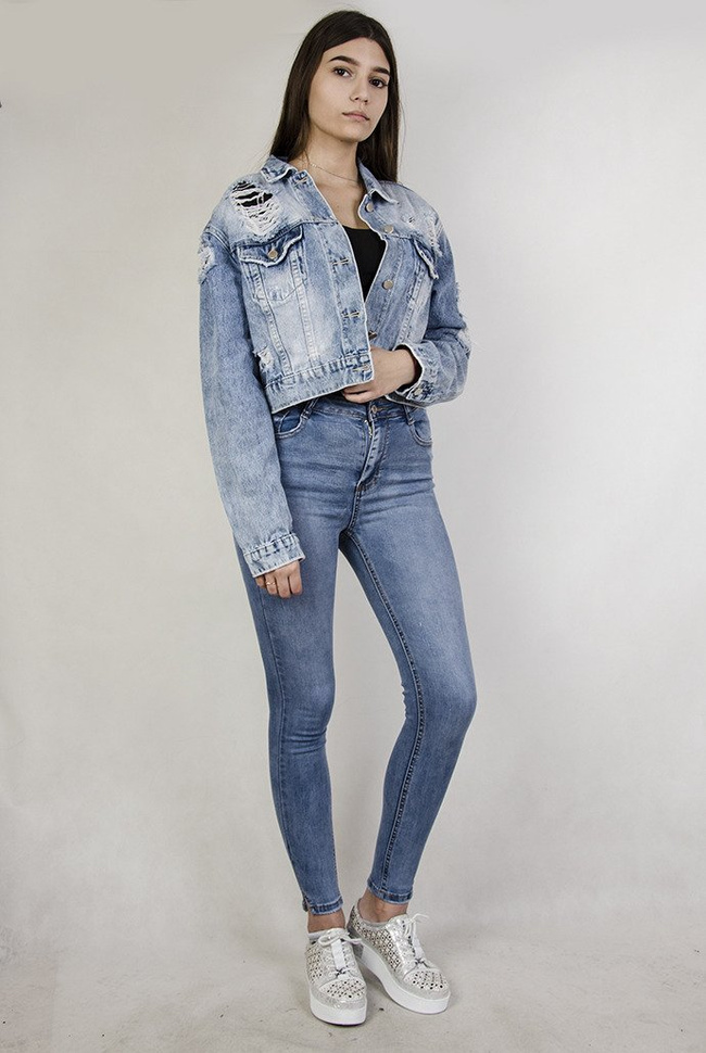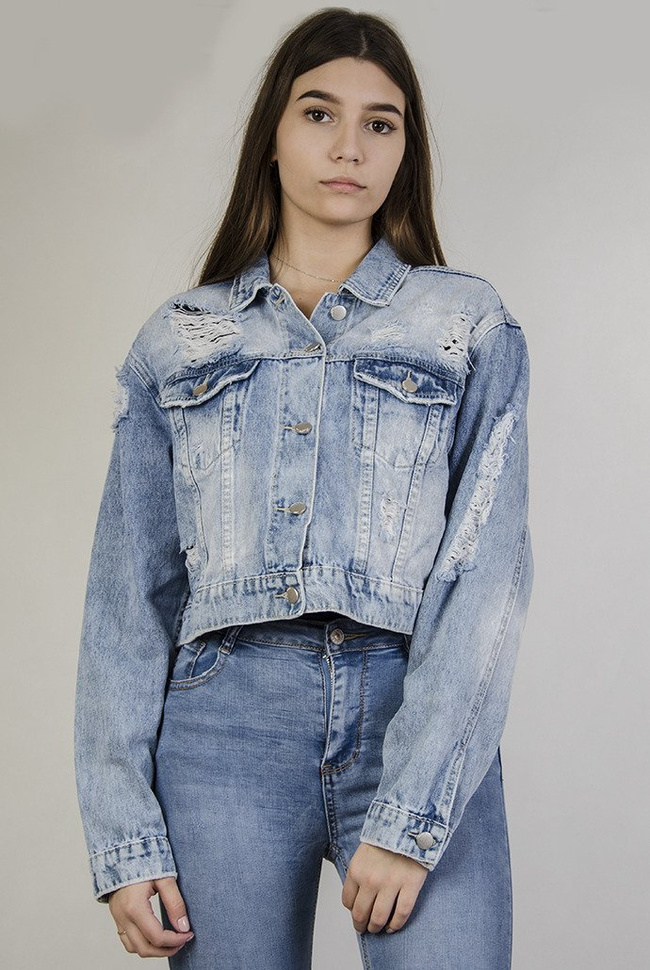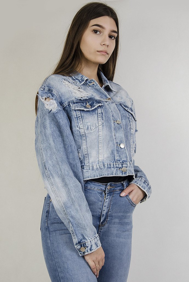 Kurtka jeansowa krótka z przetarciami oraz szarpaniami