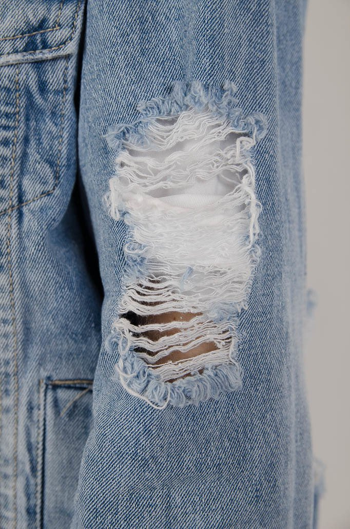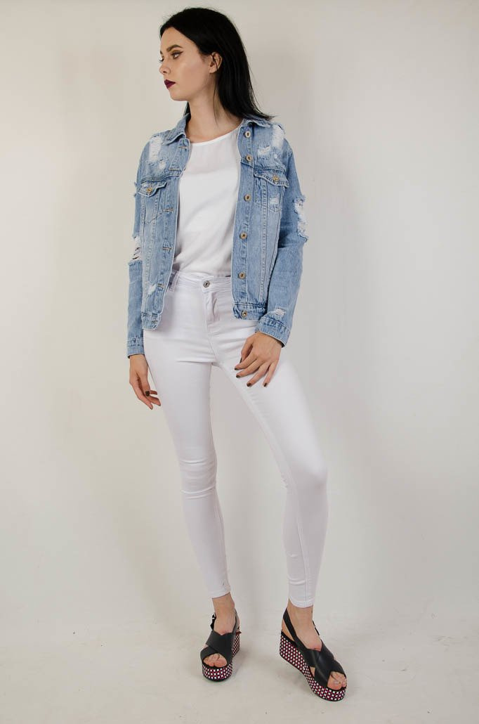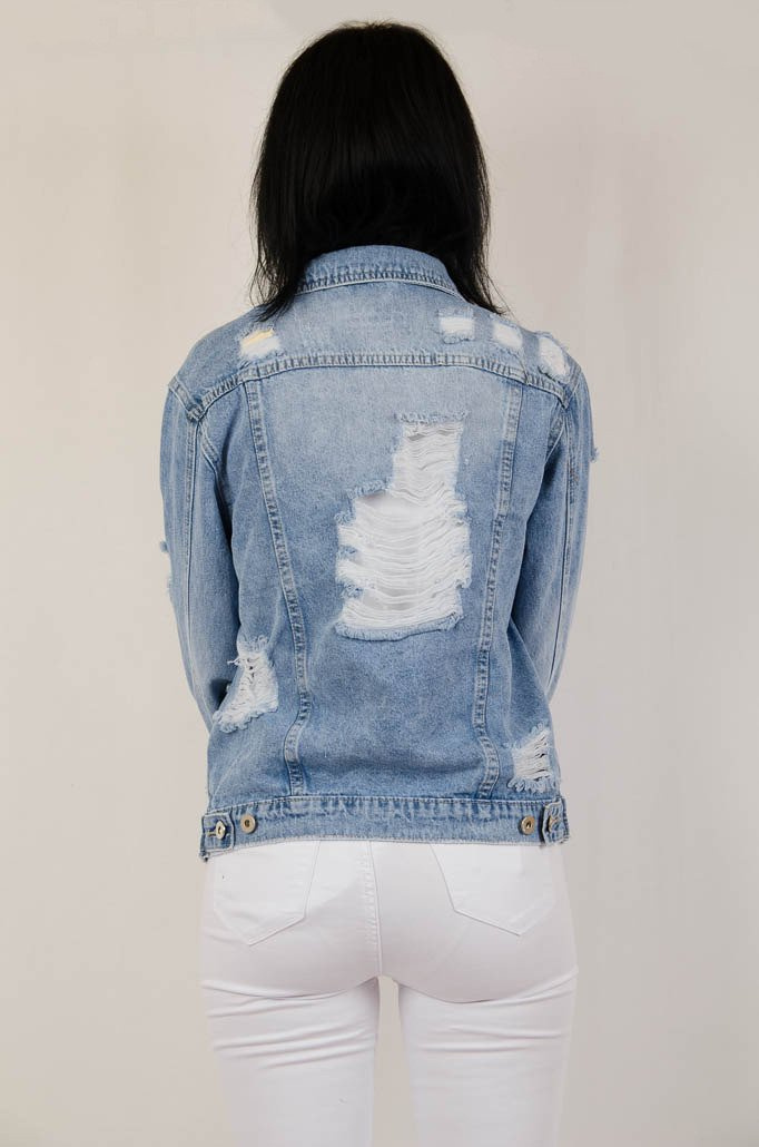 Kurtka jeansowa w jaśniejszym odcieniu jeansu, z licznymi przetarciami.