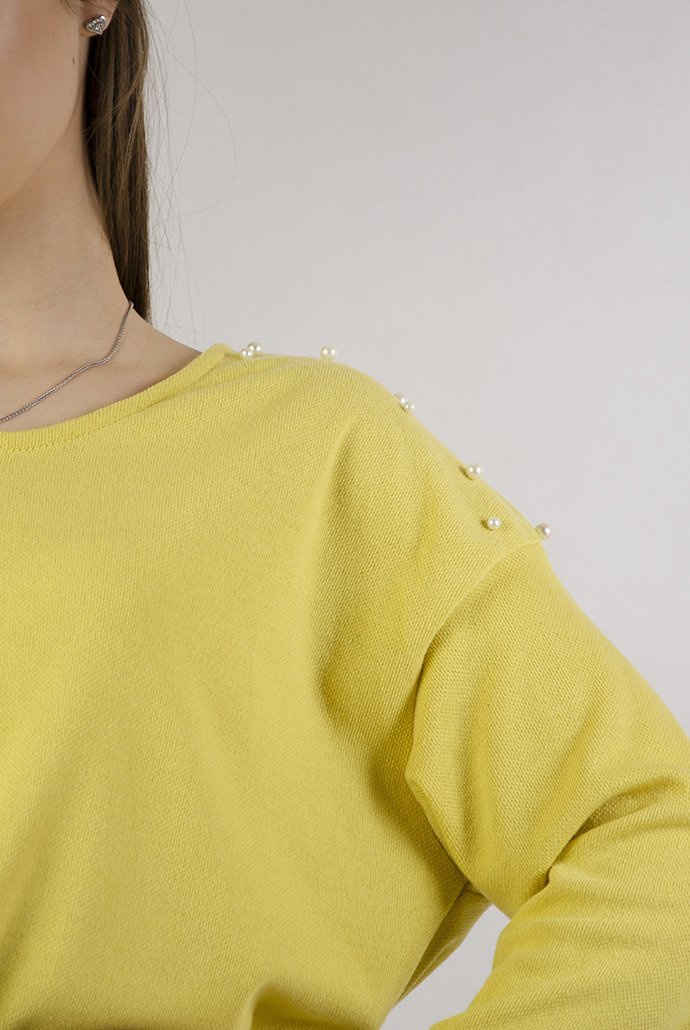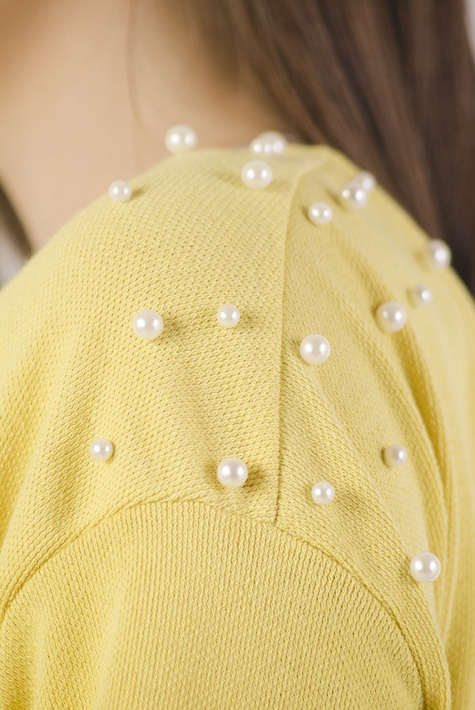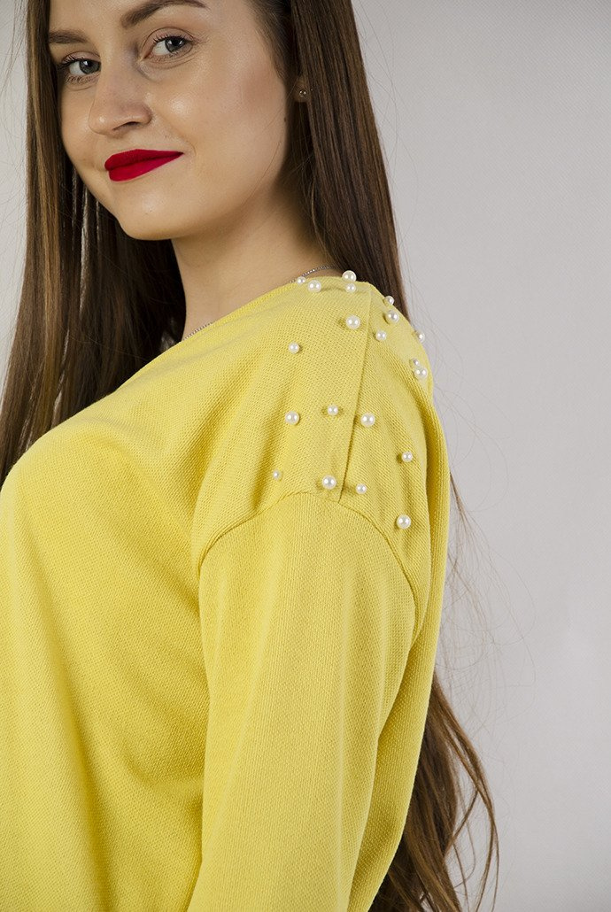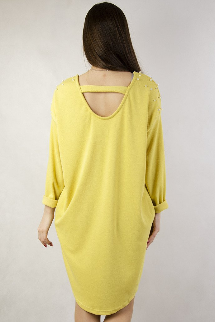 Żółta asymetryczna tunika z perełkami oraz wycięciem na plecach. Dla osób niższych sprawdzi się jako sukienka.