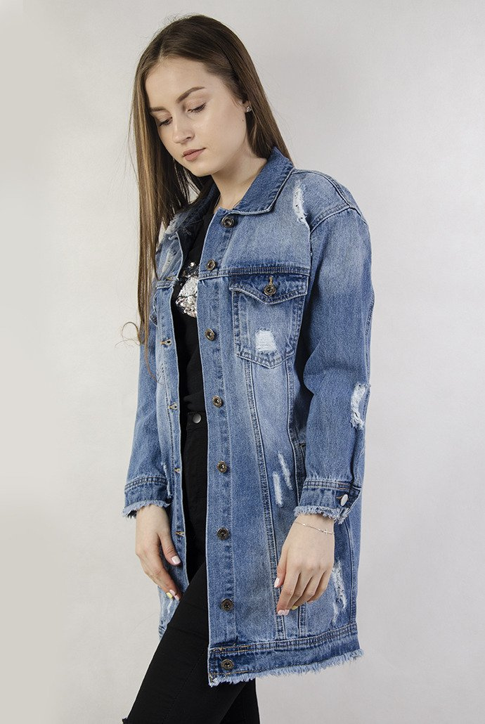 Ciemna kurtka jeansowa przedłużana z szarpaniem na dole