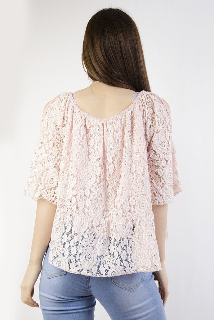 Koronkowa różowa bluzka z odkrytymi ramionami