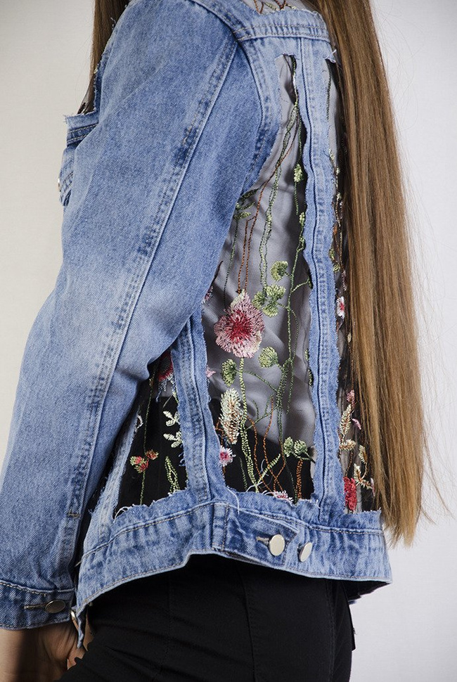 Kurtka jeansowa z haftami i elementami prześwitującymi. Wzór kwiatowy.