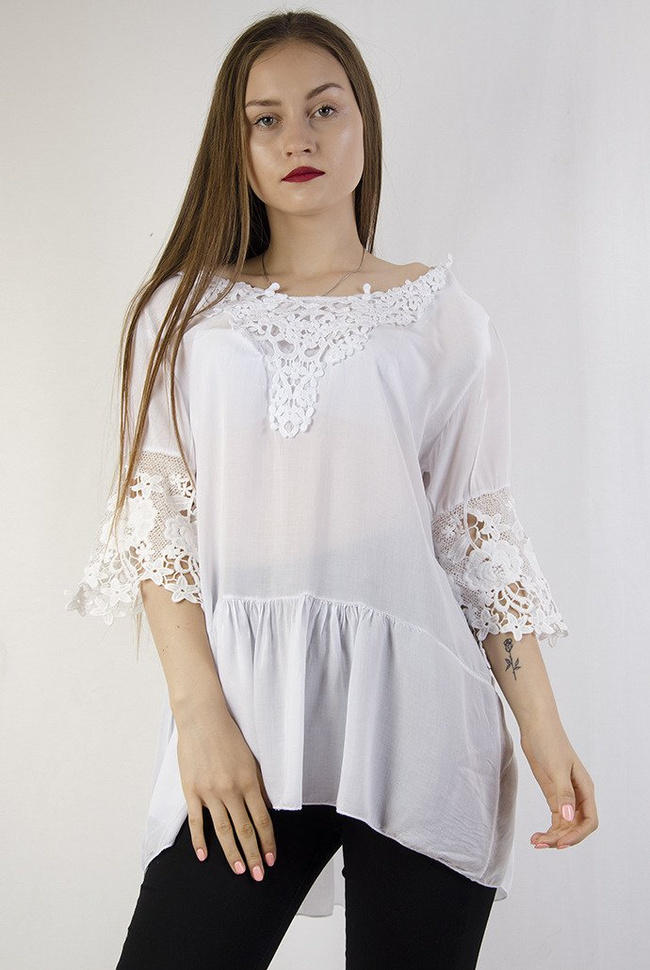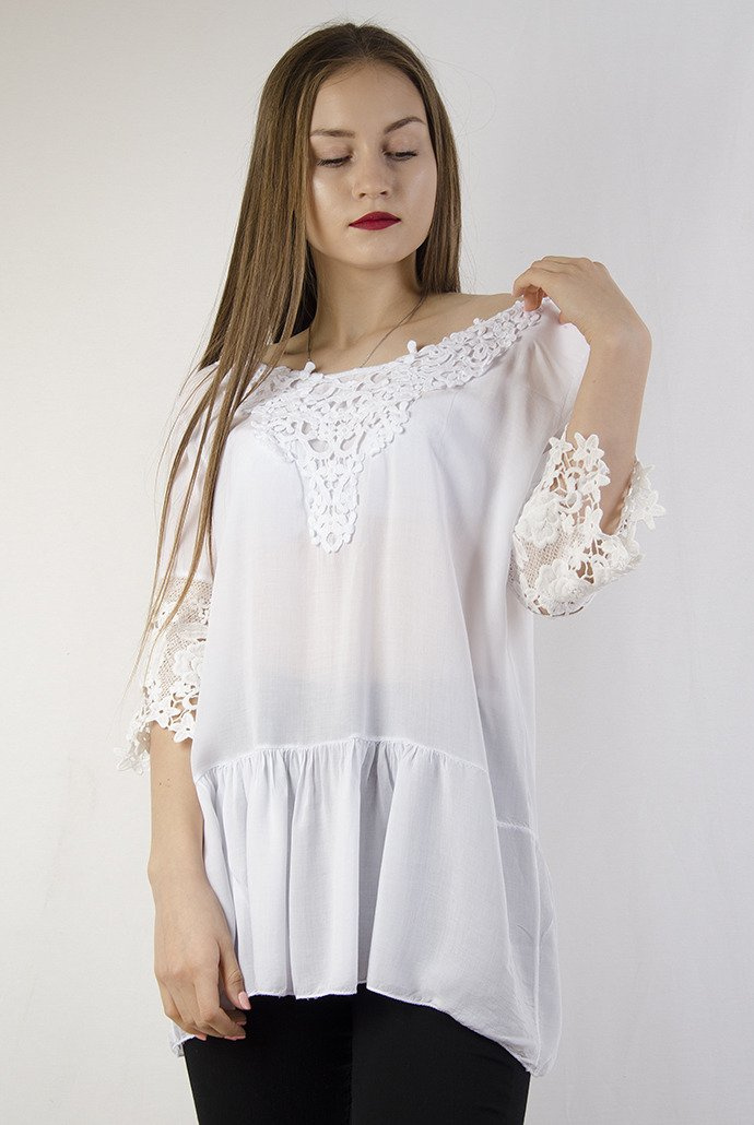 Biała bluzka z ażurowym dekoltem oraz falbanką na dole