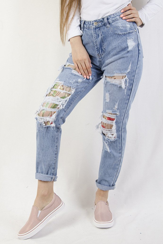 Spodnie jeansowe typu boyfriend z haftowanymi wstawkami