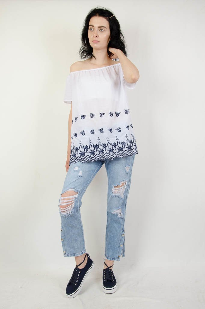 Bluzka kroju hiszpanka, biała z granatowym haftowanym wzorem. Posiada gumkę przy dekolcie