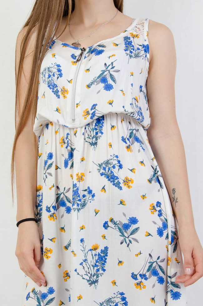 Zwiewna biało niebieska sukienka z gumką w pasie.