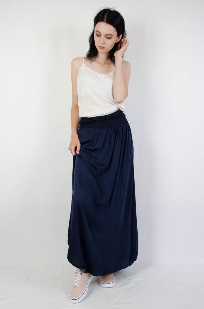 Długa zwiewna granatowa spódnica z szerokim pasem