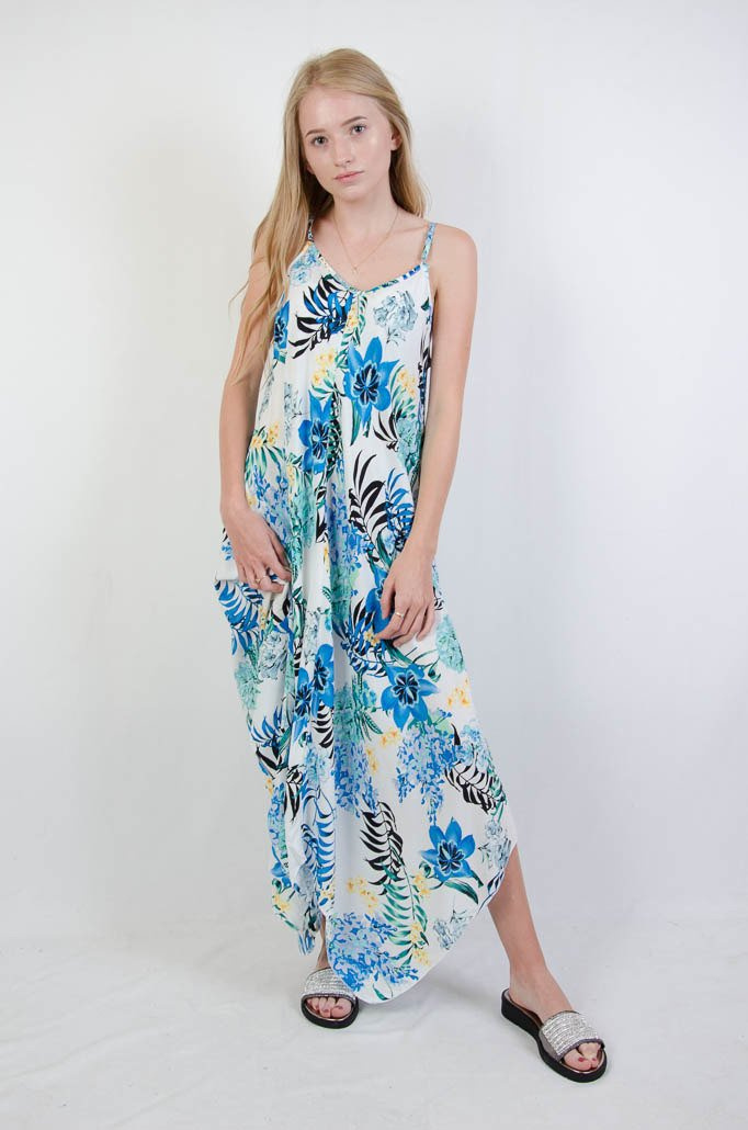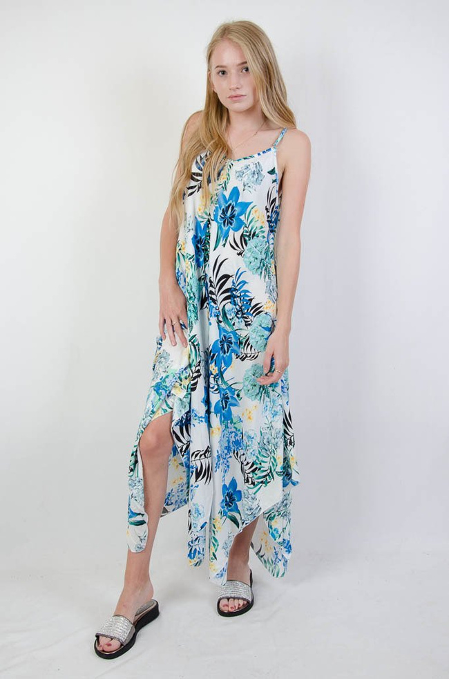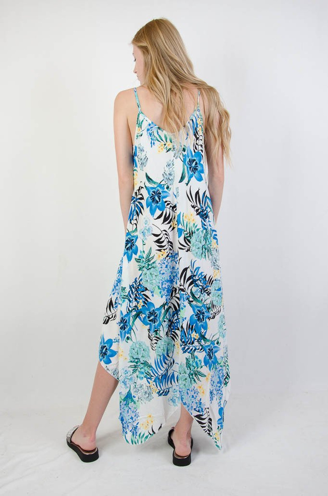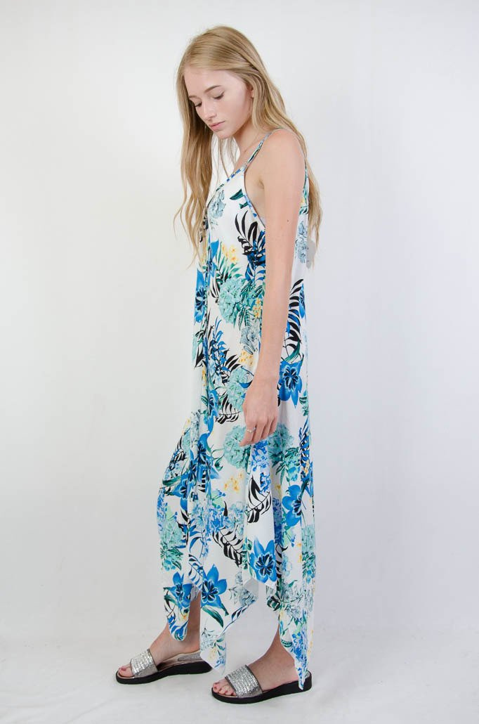 BIAŁA ASYMETRYCZNA SUKIENKA W KWIATY Z DEKOLTEM W SEREK