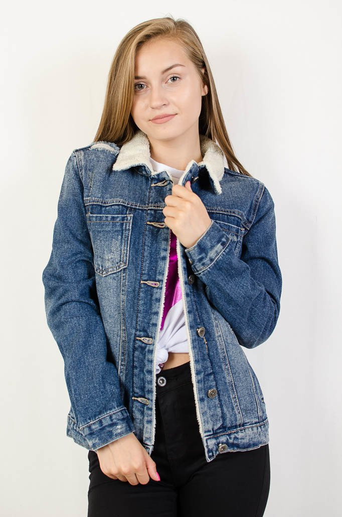 Ciemna kurtka jeansowa z kożuchem na kołnierzu oraz przy guzikach