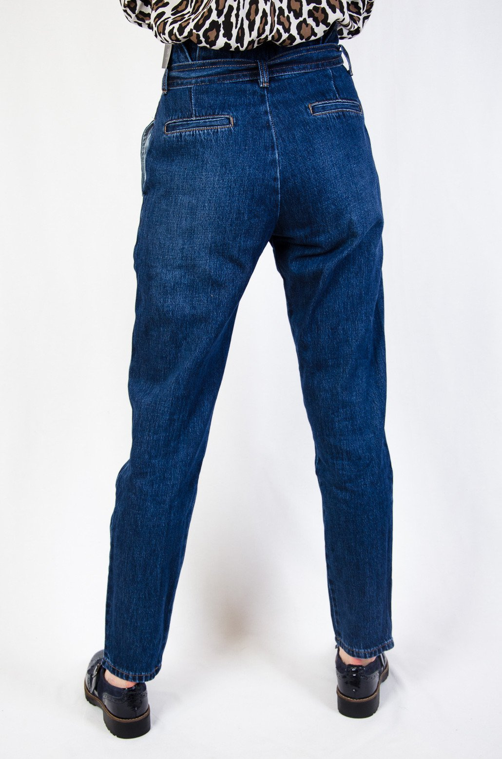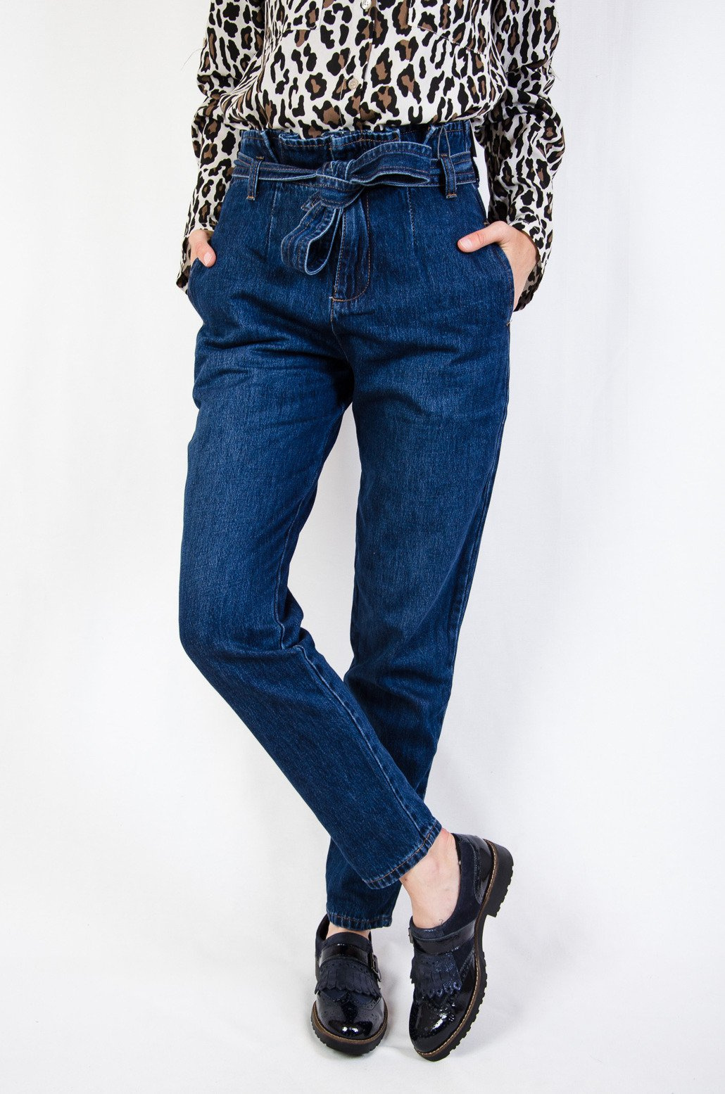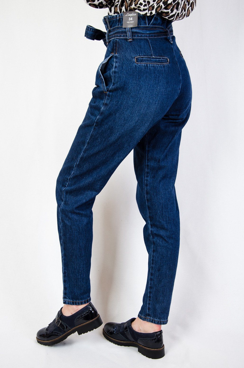 Ciemne jeansowe pumpy z wiązaniem w pasie.