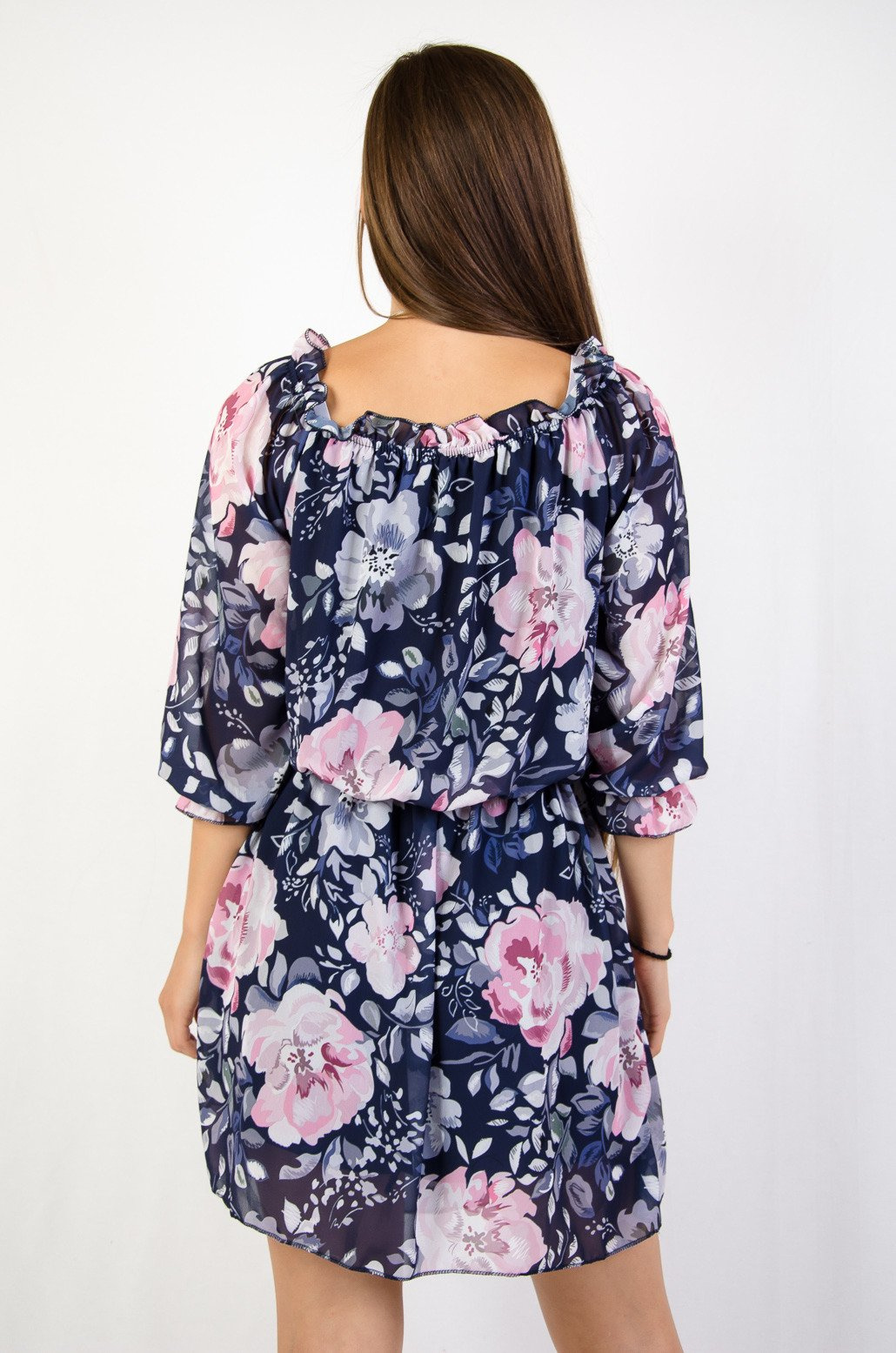 Granatowa sukienka w różowe kwiaty z gumką w pasie i wiązaniem przy dekolcie. Posiada również falbanki na końcu rękawów oraz na dekolcie.