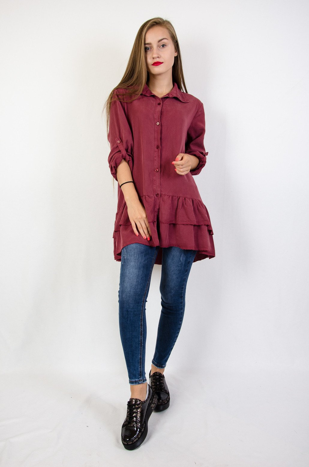 Bordowa koszula z podwijanymi rękawami oraz falbanką na dole.