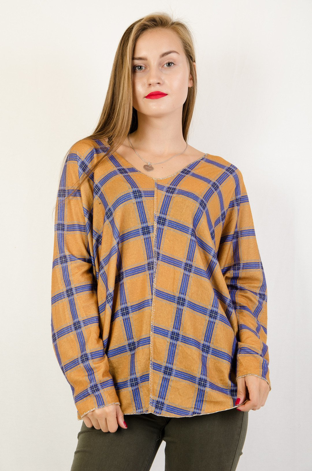 Musztardowa bluzka typu nietoperz w niebieska kratę.