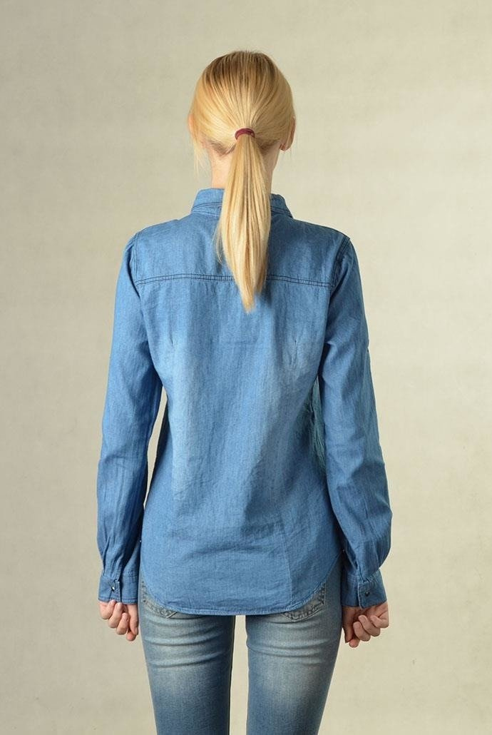 Koszula jeansowa, zapinana na zatrzaski. Kołnierzyk ozdabiany kamieniami.